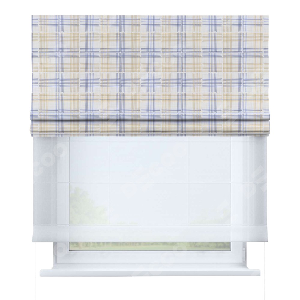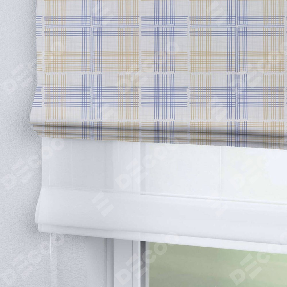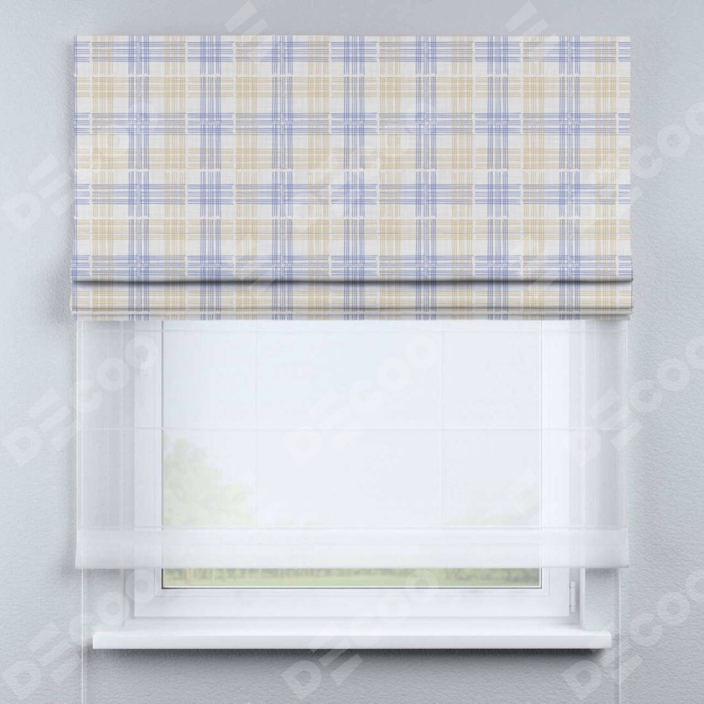 Римская штора день-ночь производителя «Cortin», используется для проёма, пошита из двух полотен, с лицевой блэкаут с нанесением сублимационной печати «Клетки кантри», вторая ткань тюль (по стандарту комплектуется тюль белого цвета артикул V-01). Имеет универсальный механизм и подходит для монтажа: на потолок, на стену и в нишу.