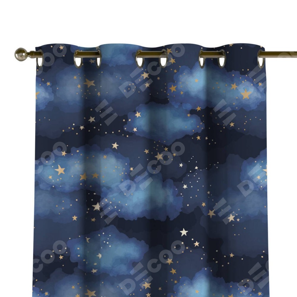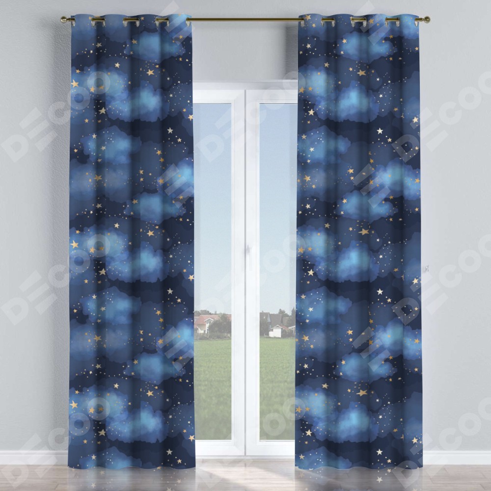 Комплект прямых штор, от производителя «Cortin», пошиты из ткани блэкаут с нанесением сублимационной печати «Золотые звёзды». Данная модель пошита на люверсах, комплектуется на выбор круглым карнизом и подходит для монтажа на стену или потолок. Прямые шторы на люверсах шьются по стандарту с коэффициентом 1/2 (на 100 см. ширины проёма 200 см. ширины ткани), отличительным преимуществом данной модели является простой способ монтажа. Достаточно повесить ее на трубу и штора готова!