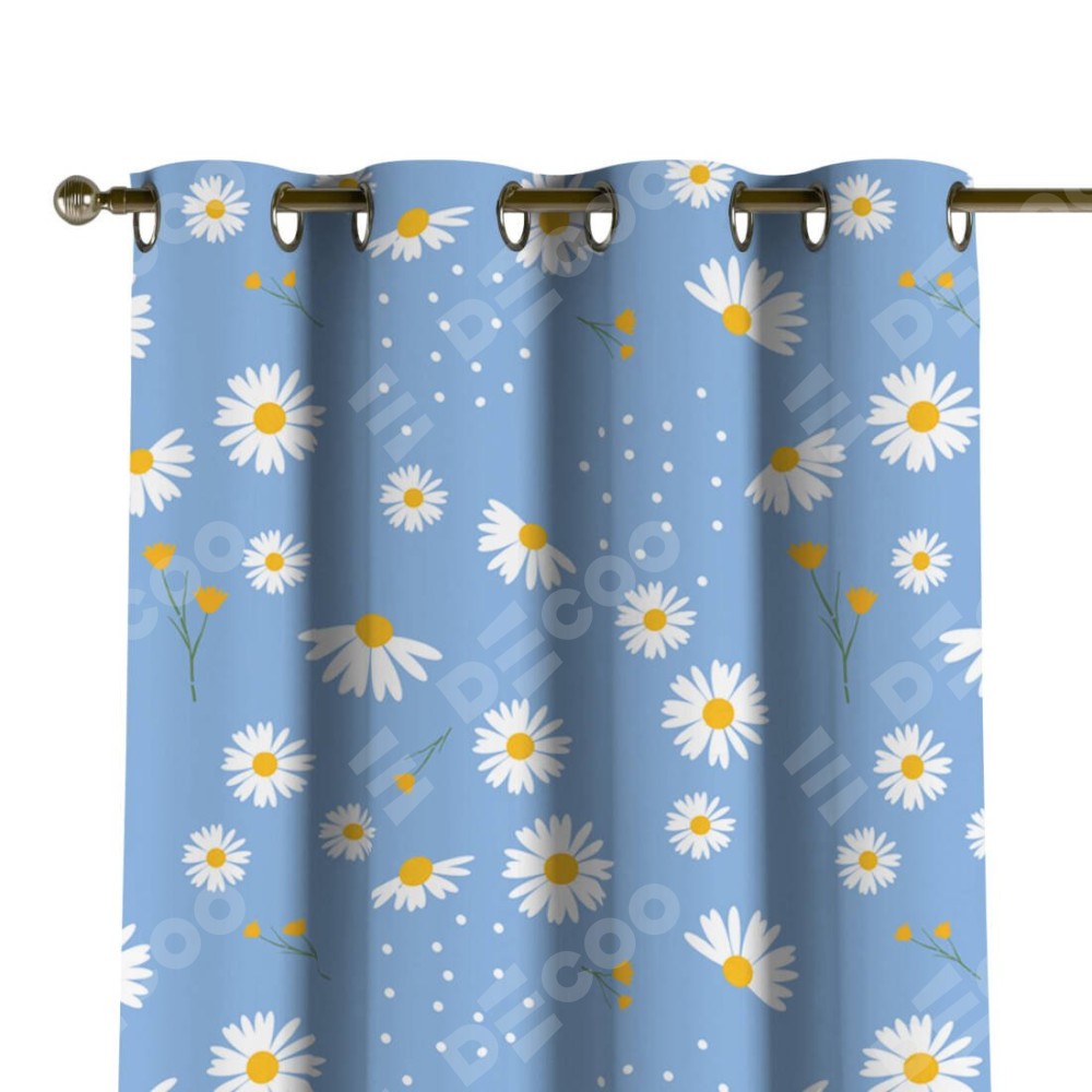 Комплект прямых штор, от производителя «Cortin», пошиты из ткани блэкаут с нанесением сублимационной печати «Ромашки на голубом». Данная модель пошита на люверсах, комплектуется на выбор круглым карнизом и подходит для монтажа на стену или потолок. Прямые шторы на люверсах шьются по стандарту с коэффициентом 1/2 (на 100 см. ширины проёма 200 см. ширины ткани), отличительным преимуществом данной модели является простой способ монтажа. Достаточно повесить ее на трубу и штора готова!