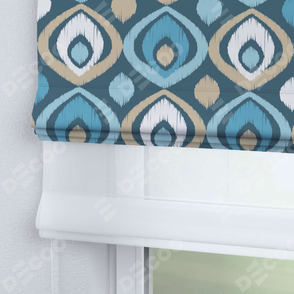 Римская штора день-ночь производителя «Cortin», используется для проёма, пошита из двух полотен, с лицевой блэкаут с нанесением сублимационной печати «Икат орнамент», вторая ткань тюль (по стандарту комплектуется тюль белого цвета артикул V-01). Имеет универсальный механизм и подходит для монтажа: на потолок, на стену и в нишу.