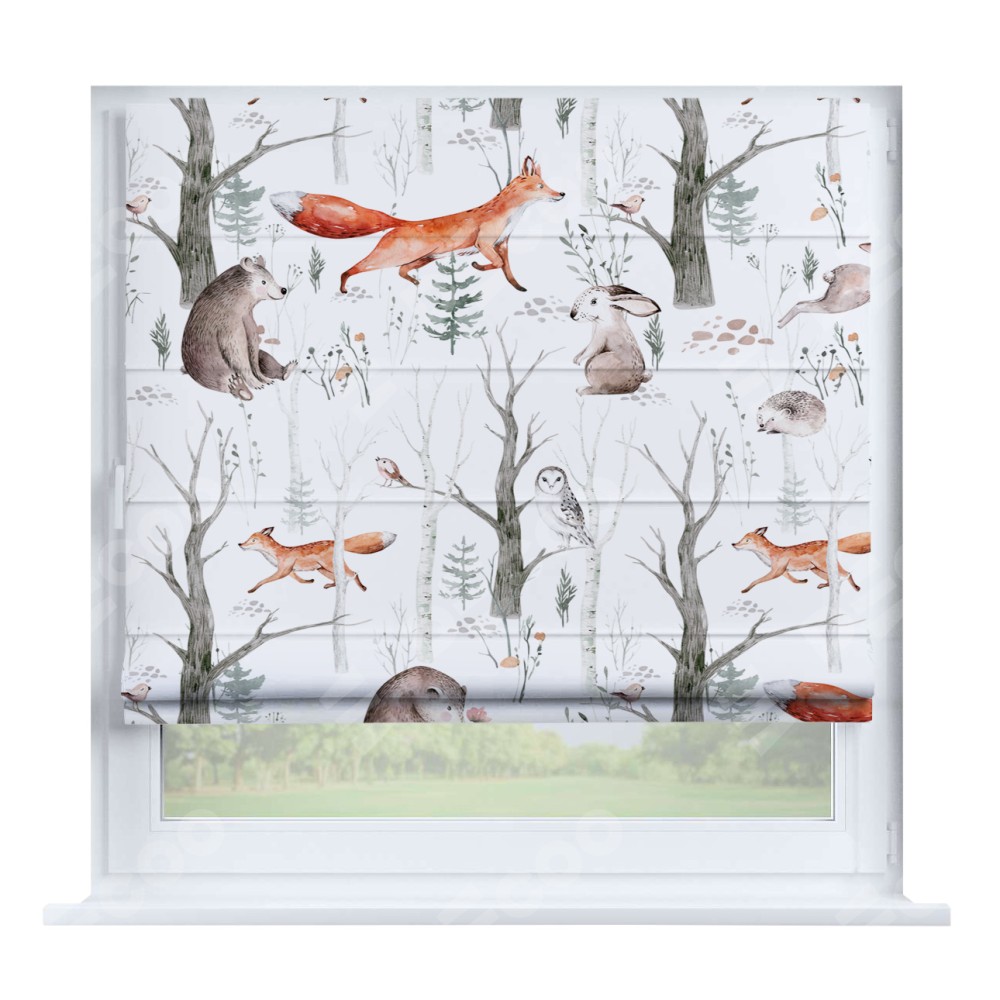 Римская штора производителя «Cortin», устанавливается на створку окна, пошита из ткани блэкаут с нанесением сублимационной печати «Лесной питомник». Штора шьётся по индивидуальным размерам, для данного типа римской шторы возможная ширина от 35 до 150 см., высота до 250 см.