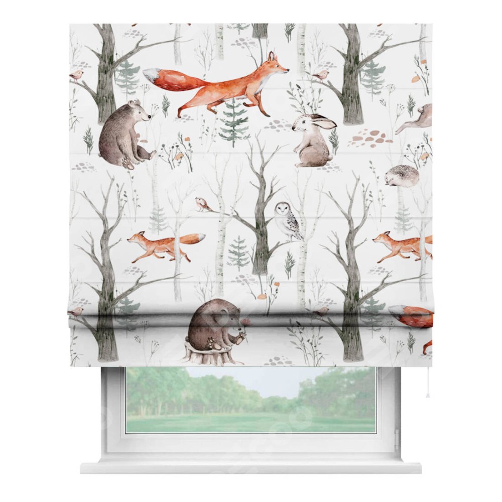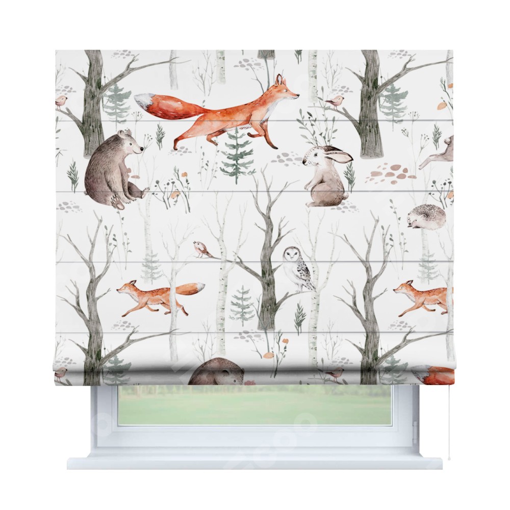 Римская штора производителя «Cortin», используется для проёма, пошита из ткани блэкаут с нанесением сублимационной печати «Лесной питомник». Имеет универсальный механизм и подходит для монтажа: на потолок, на стену и в нишу.