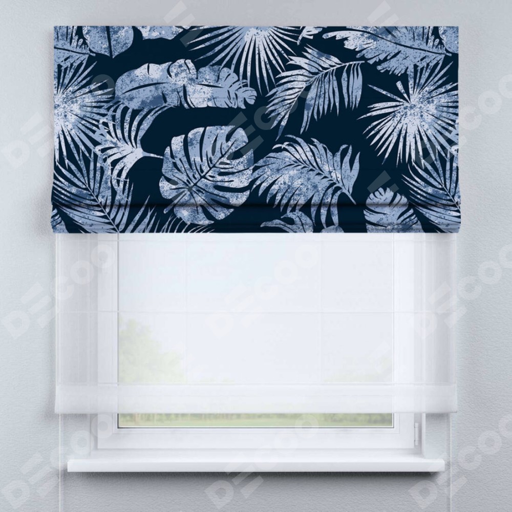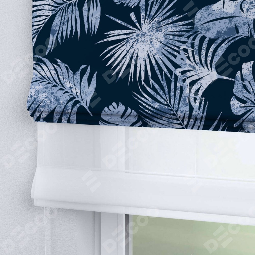 Римская штора день-ночь производителя «Cortin», используется для проёма, пошита из двух полотен, с лицевой блэкаут с нанесением сублимационной печати «Тропическая ночь», вторая ткань тюль (по стандарту комплектуется тюль белого цвета артикул V-01). Имеет универсальный механизм и подходит для монтажа: на потолок, на стену и в нишу.