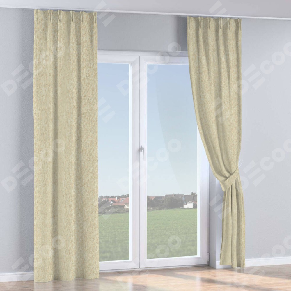 Комплект прямых штор, от производителя «Cortin», пошиты из ткани стиф димаут светло-бежевый, артикул ткани 18084. С изнаночной стороны в верхней части штор пристрачивается шторная лента с декоративными складками «Кустик». Для создания элегантных складок прямые шторы шьются по стандарту с коэффициентом 1:2 (на 100 см. ширины проёма 200 см. ширины ткани).