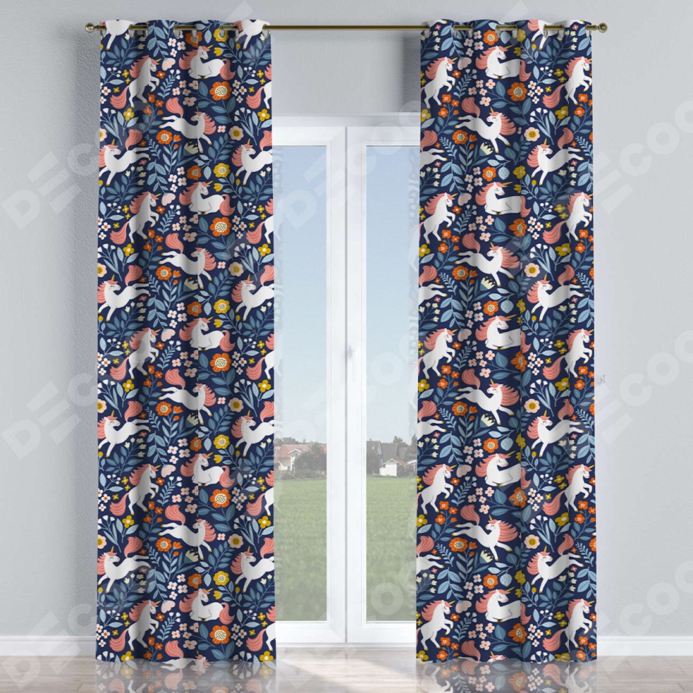 Комплект прямых штор, от производителя «Cortin», пошиты из ткани блэкаут с нанесением сублимационной печати «Цветы и единороги». Данная модель пошита на люверсах, комплектуется на выбор круглым карнизом и подходит для монтажа на стену или потолок. Прямые шторы на люверсах шьются по стандарту с коэффициентом 1/2 (на 100 см. ширины проёма 200 см. ширины ткани), отличительным преимуществом данной модели является простой способ монтажа. Достаточно повесить ее на трубу и штора готова!