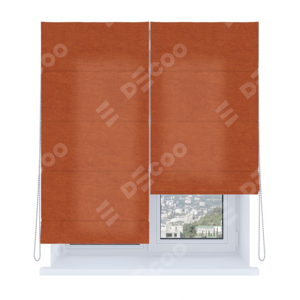 Римская штора производителя «Cortin», используется для проёма, пошита из ткани вельвет терракотовый, артикул ткани 85548. Имеет универсальный механизм и подходит для монтажа: на потолок, на стену и в нишу. Удобное управление каждой шторой отдельно.