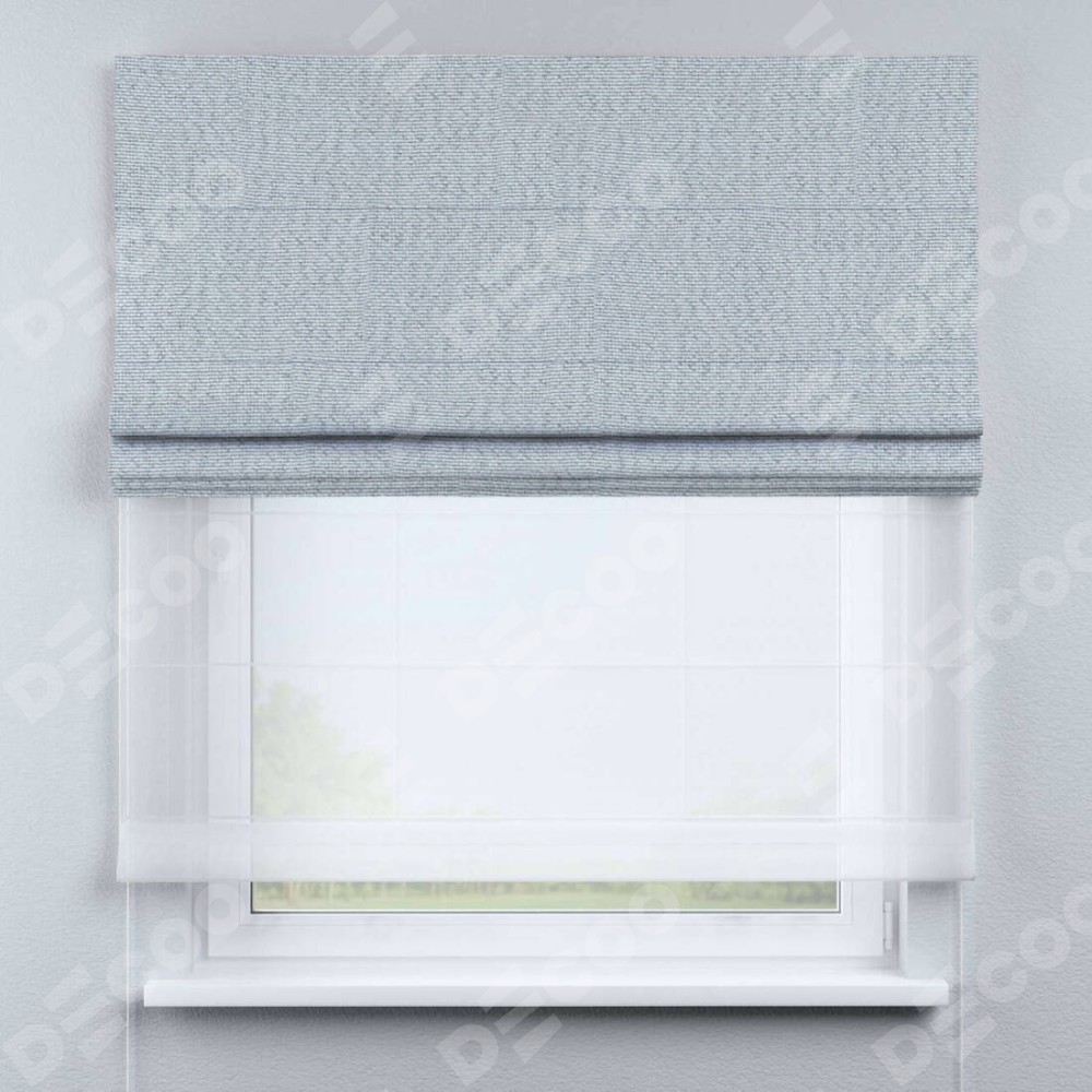 Римская штора день-ночь производителя «Cortin», используется для проёма, пошита из двух полотен, с лицевой стороны лён димаут серый артикул F3, вторая ткань тюль (по стандарту комплектуется тюль белого цвета артикул V-01). Имеет универсальный механизм и подходит для монтажа: на потолок, на стену и в нишу.