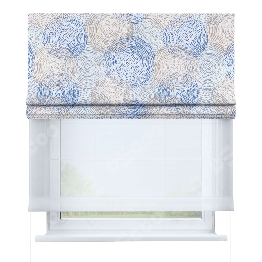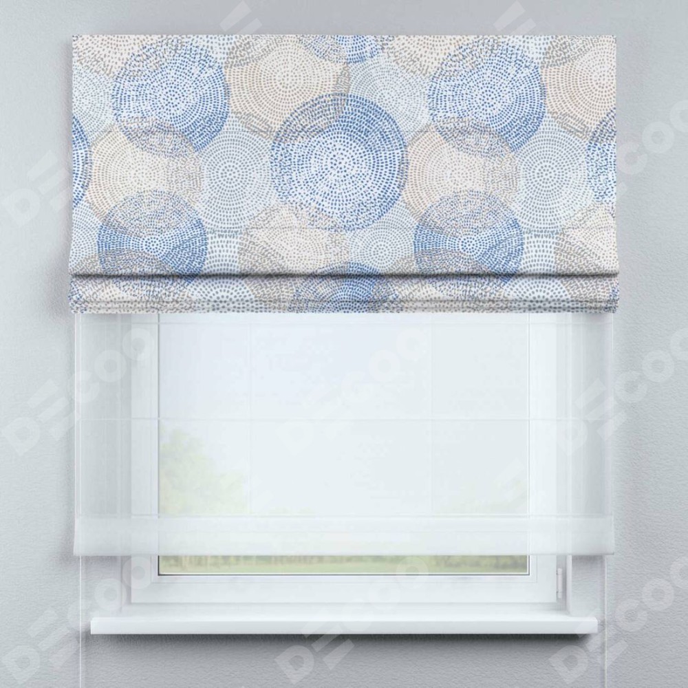 Римская штора день-ночь производителя «Cortin», используется для проёма, пошита из двух полотен, с лицевой блэкаут с нанесением сублимационной печати «Абстрактные круги», вторая ткань тюль (по стандарту комплектуется тюль белого цвета артикул V-01). Имеет универсальный механизм и подходит для монтажа: на потолок, на стену и в нишу.