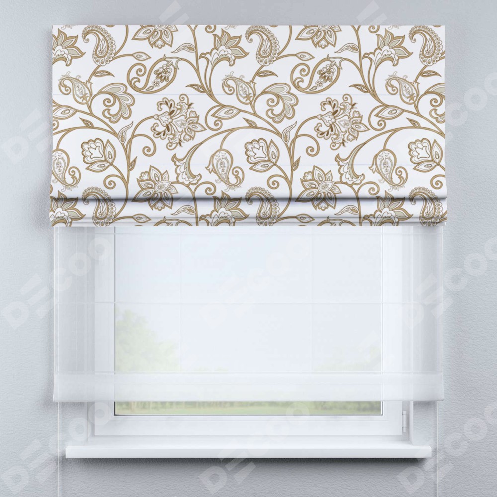 Римская штора день-ночь производителя «Cortin», используется для проёма, пошита из двух полотен, с лицевой блэкаут с нанесением сублимационной печати «Королевская роскошь», вторая ткань тюль (по стандарту комплектуется тюль белого цвета артикул V-01). Имеет универсальный механизм и подходит для монтажа: на потолок, на стену и в нишу.