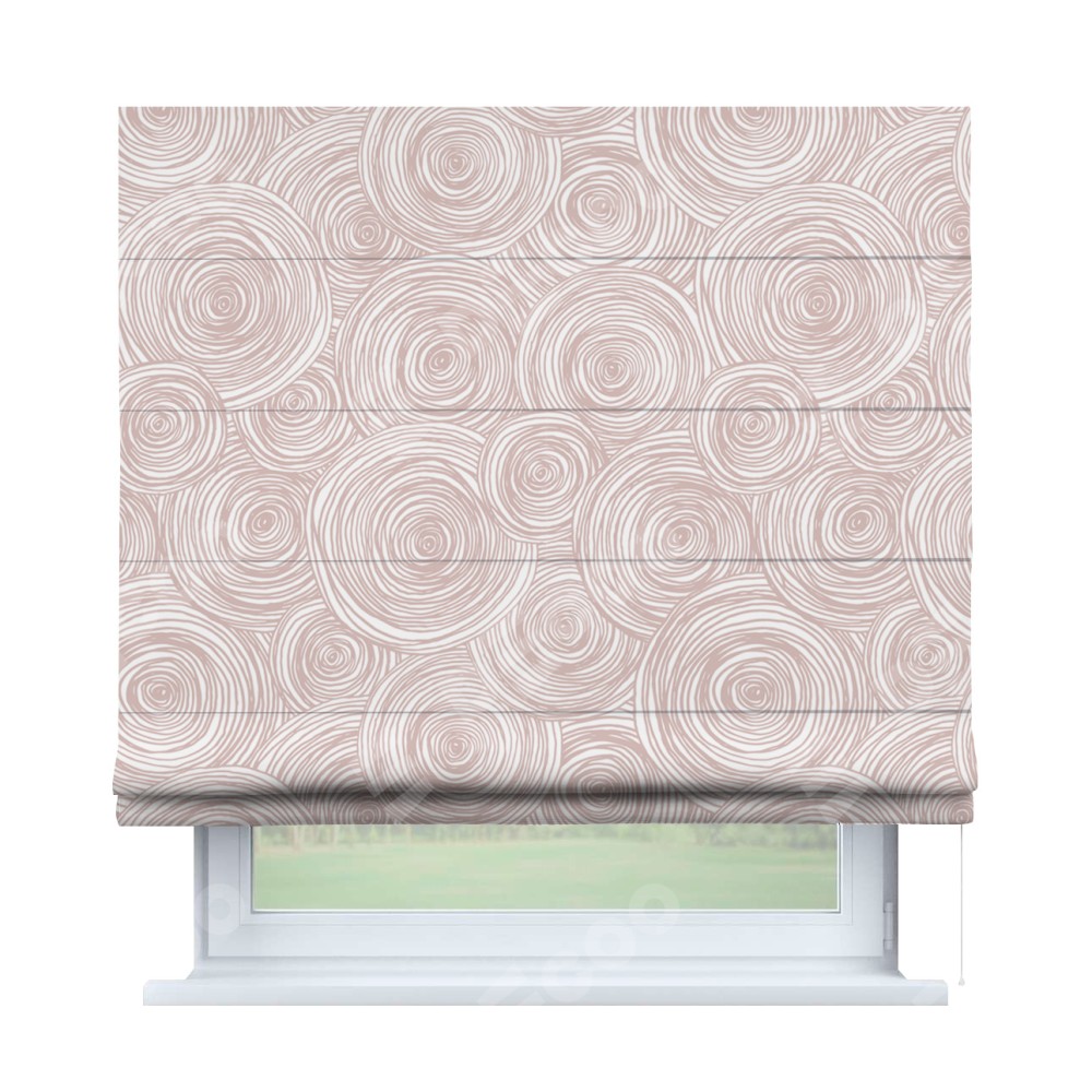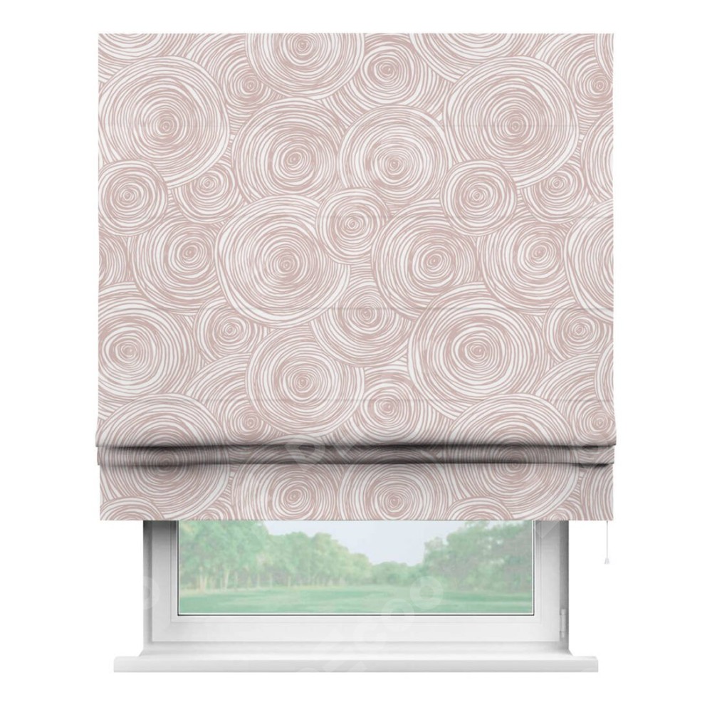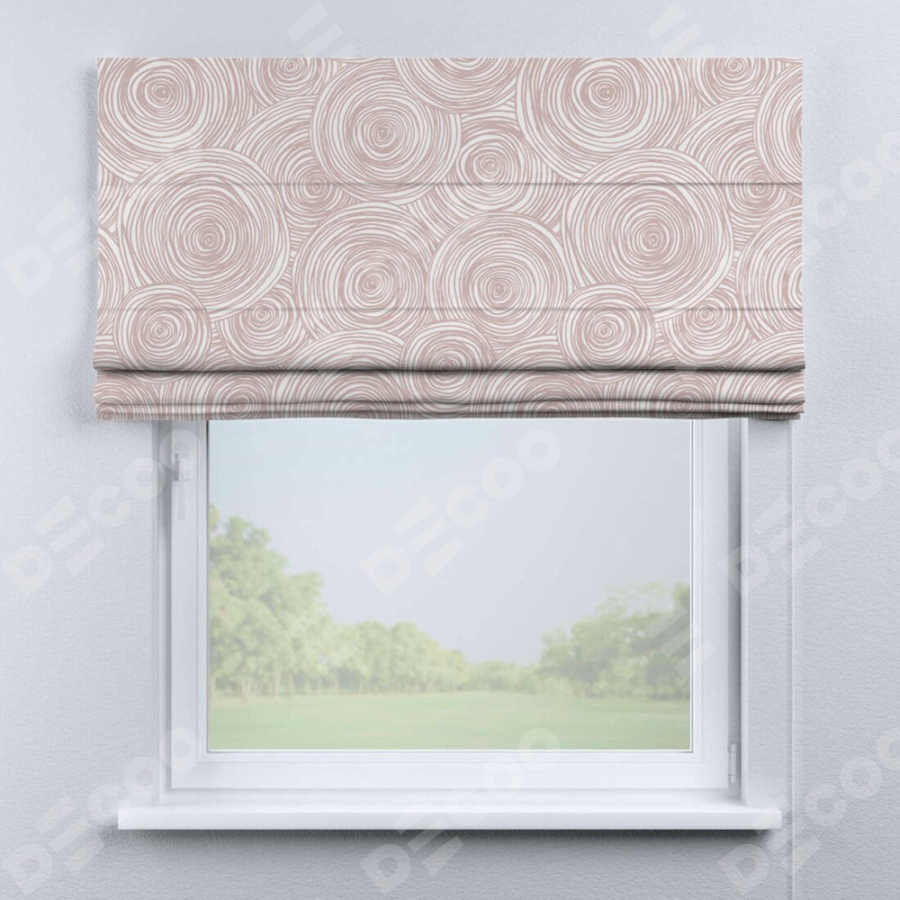 Римская штора производителя «Cortin», используется для проёма, пошита из ткани блэкаут с нанесением сублимационной печати «Бежевые круги». Имеет универсальный механизм и подходит для монтажа: на потолок, на стену и в нишу.