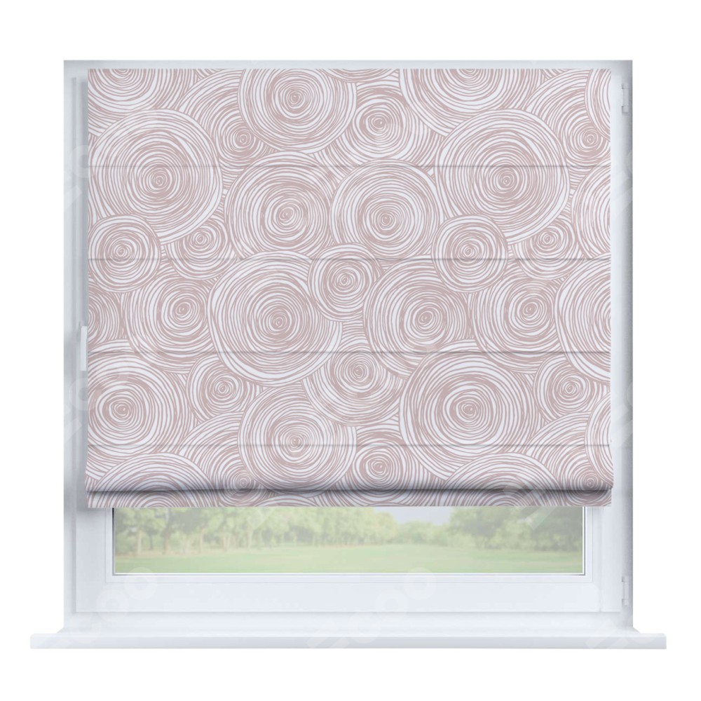 Римская штора производителя «Cortin», устанавливается на створку окна, пошита из ткани блэкаут с нанесением сублимационной печати «Бежевые круги». Штора шьётся по индивидуальным размерам, для данного типа римской шторы возможная ширина от 35 до 150 см., высота до 250 см.