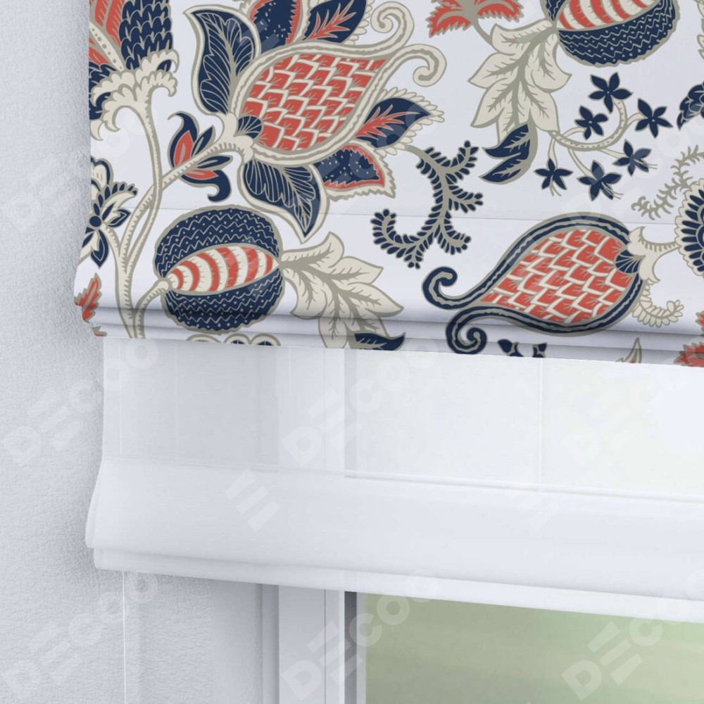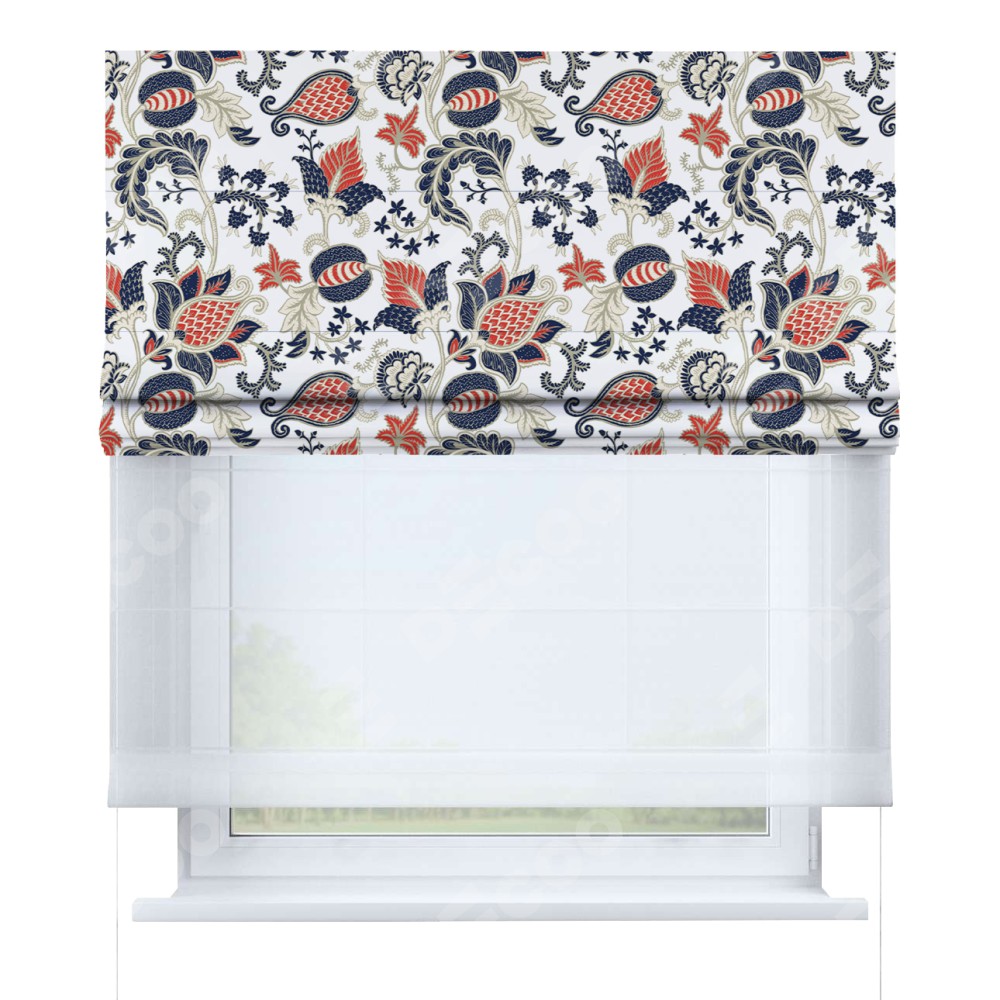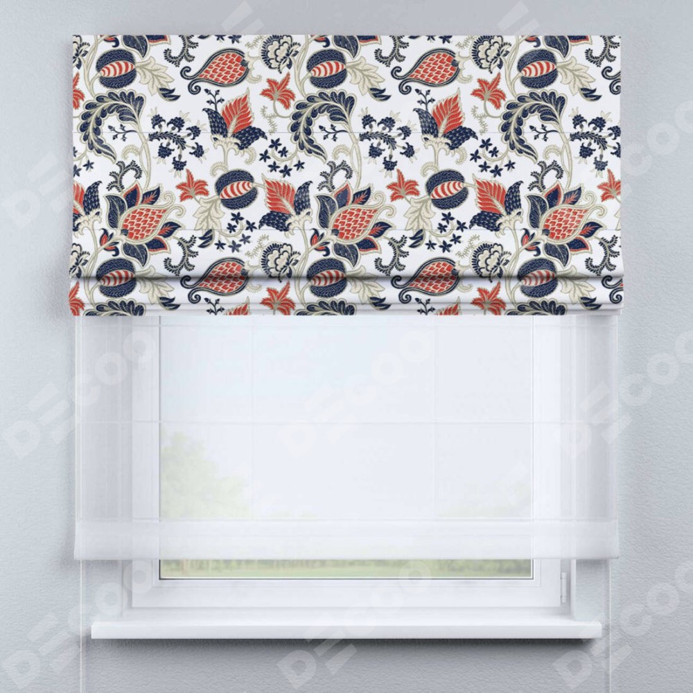 Римская штора день-ночь производителя «Cortin», используется для проёма, пошита из двух полотен, с лицевой блэкаут с нанесением сублимационной печати «Пёстрые цветы», вторая ткань тюль (по стандарту комплектуется тюль белого цвета артикул V-01). Имеет универсальный механизм и подходит для монтажа: на потолок, на стену и в нишу.