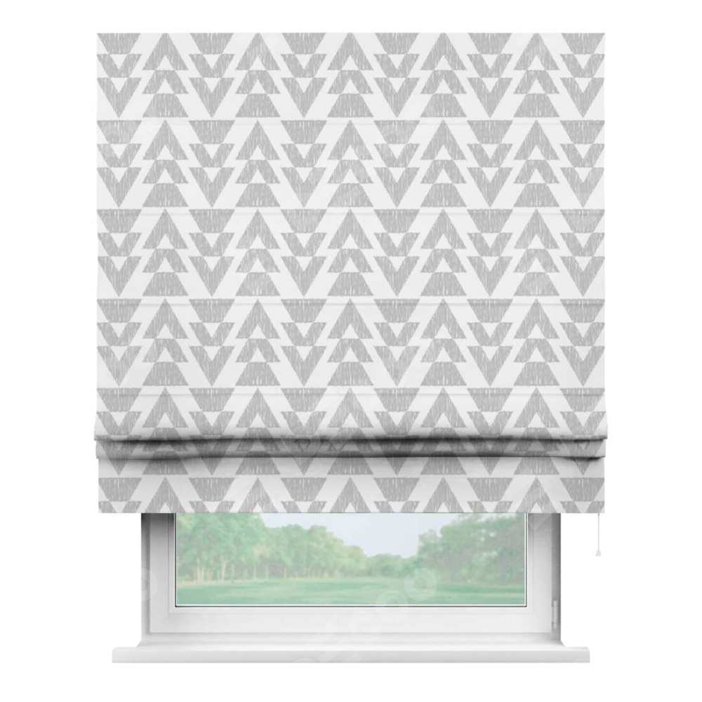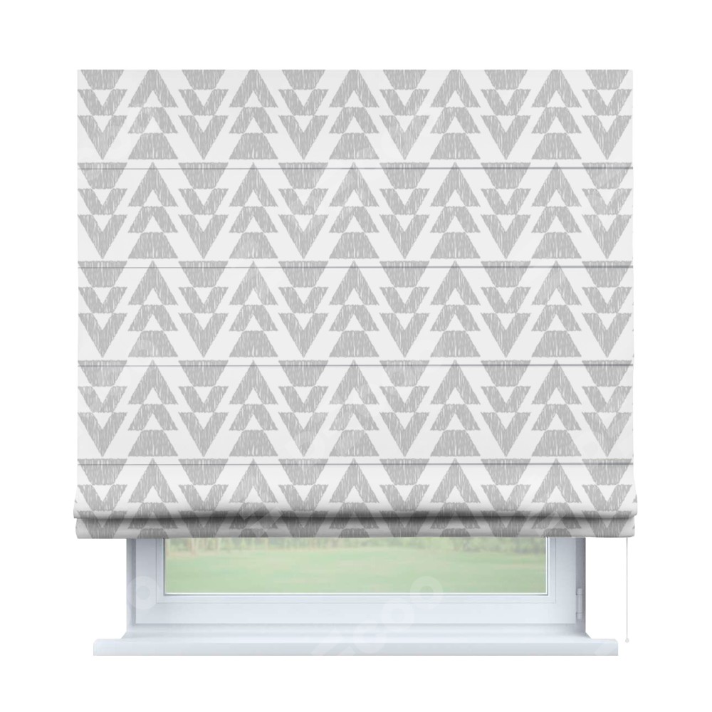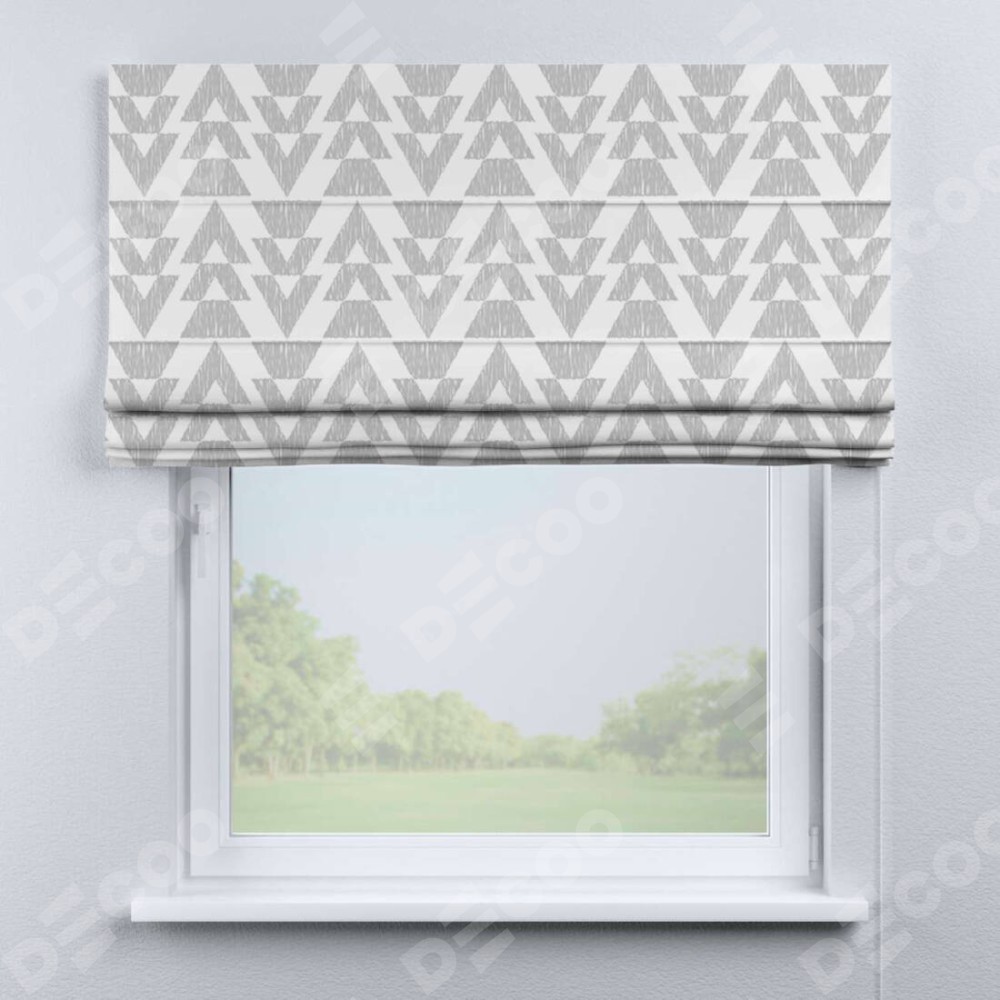 Римская штора производителя «Cortin», используется для проёма, пошита из ткани блэкаут с нанесением сублимационной печати «Серые стрелки». Имеет универсальный механизм и подходит для монтажа: на потолок, на стену и в нишу.
