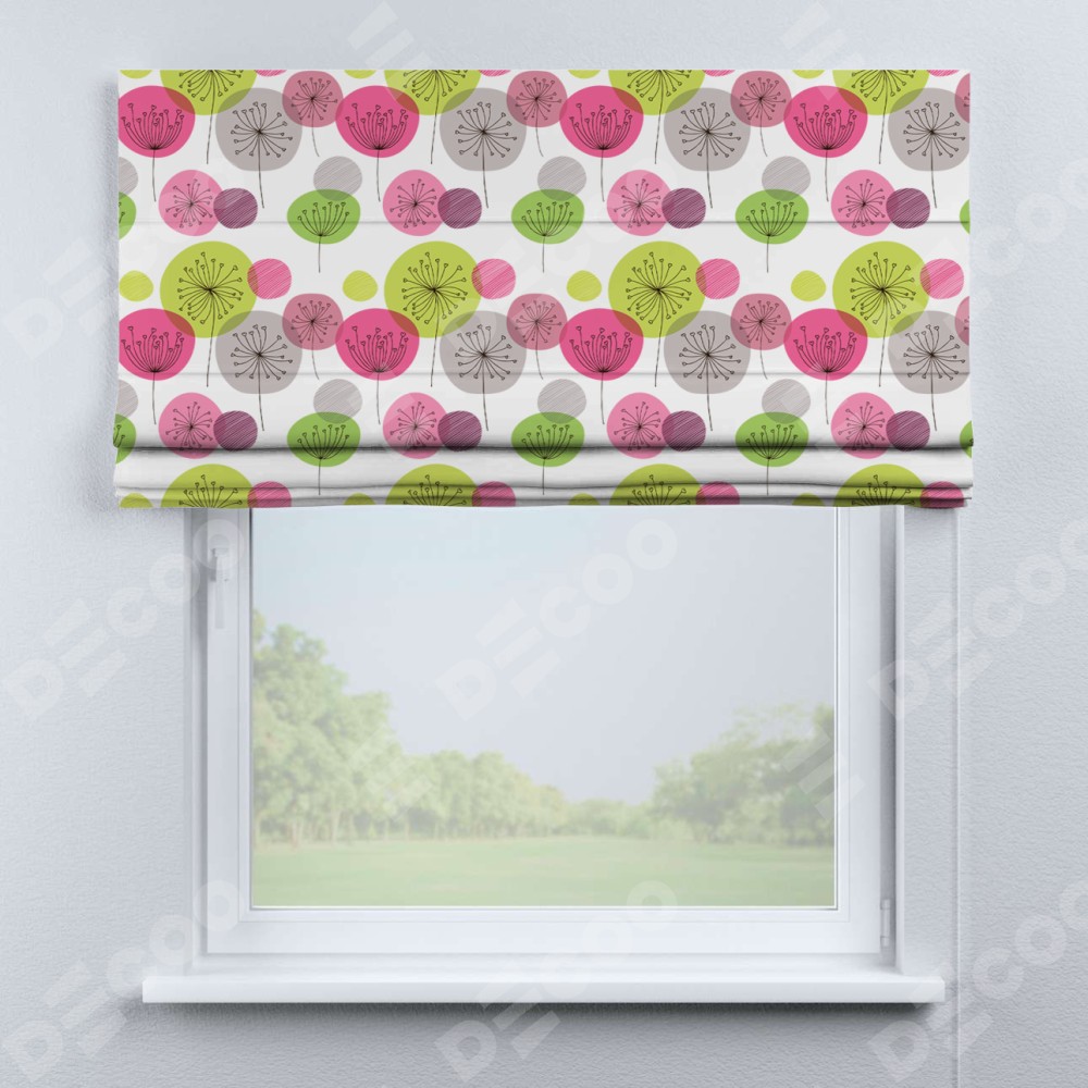 Римская штора производителя «Cortin», используется для проёма, пошита из ткани блэкаут с нанесением сублимационной печати «Цветные одуванчики». Имеет универсальный механизм и подходит для монтажа: на потолок, на стену и в нишу.