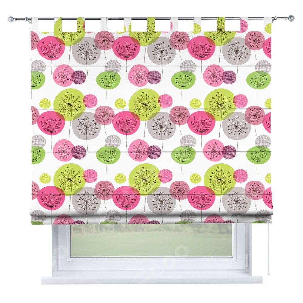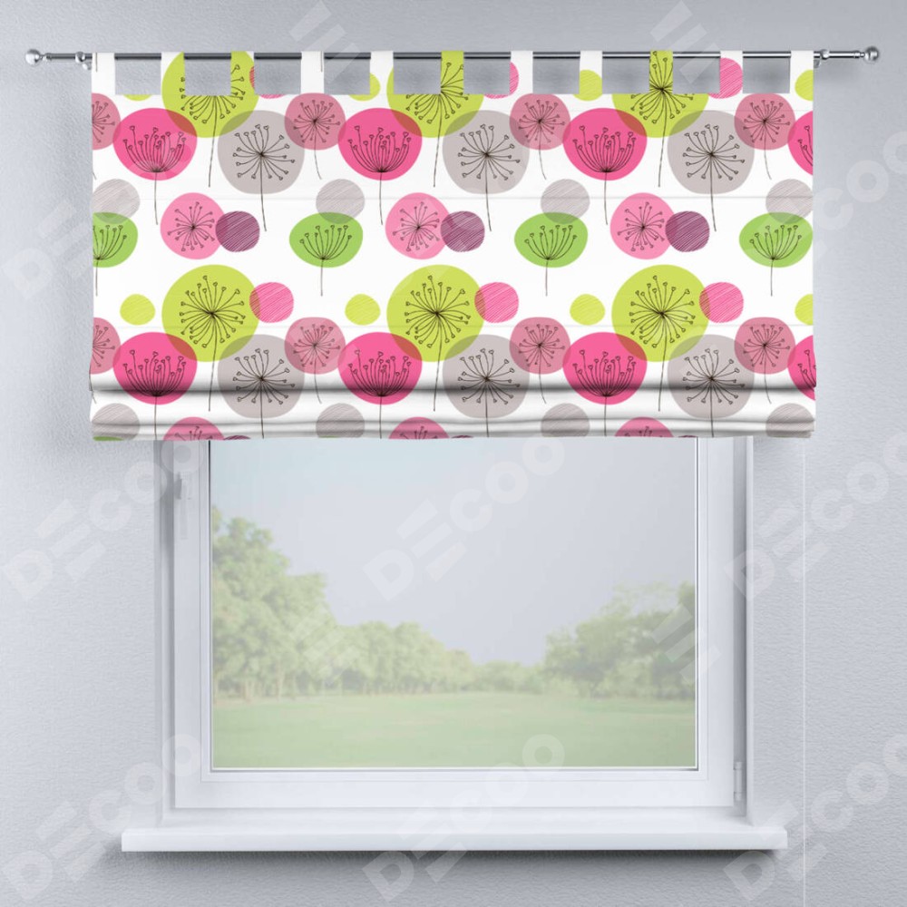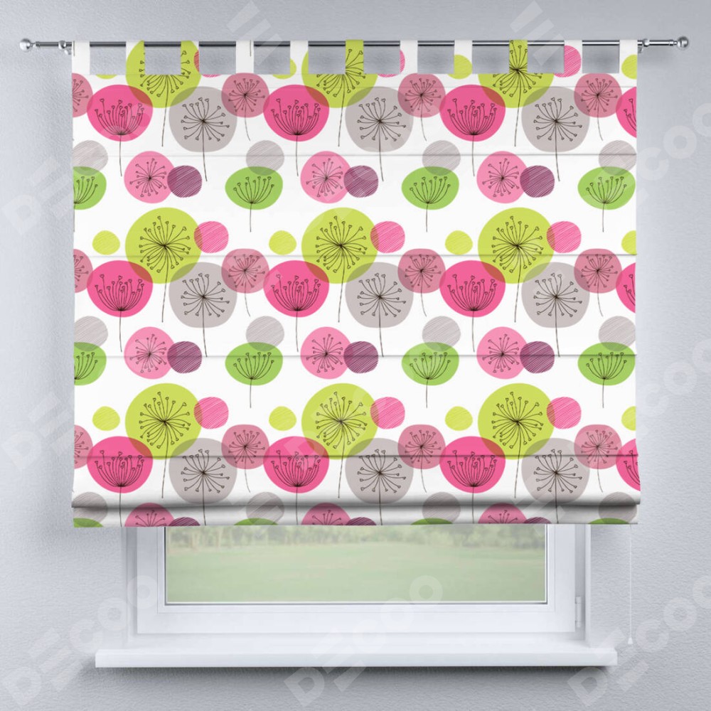 Римская штора производителя «Cortin», используется для проёма, пошита из ткани блэкаут с нанесением сублимационной печати «Цветные одуванчики». Данная модель пошита на петлях, комплектуется на выбор круглым карнизом и подходит для монтажа на стену. Римская штора на петлях имеет простую систему регулировки высоты, отличительным преимуществом данной модели является простой способ монтажа. Достаточно повесить ее на трубу и штора готова!