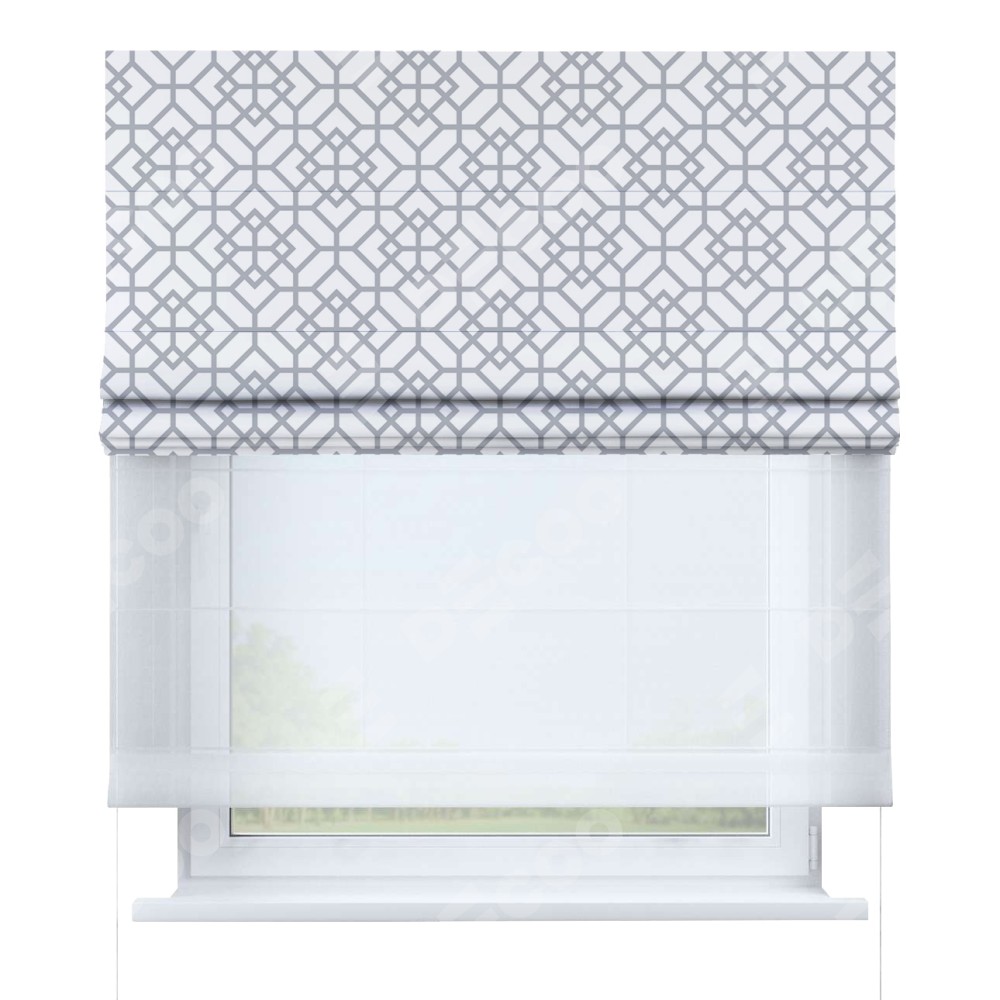 Римская штора день-ночь производителя «Cortin», используется для проёма, пошита из двух полотен, с лицевой блэкаут с нанесением сублимационной печати «Архитектурный орнамент», вторая ткань тюль (по стандарту комплектуется тюль белого цвета артикул V-01). Имеет универсальный механизм и подходит для монтажа: на потолок, на стену и в нишу.