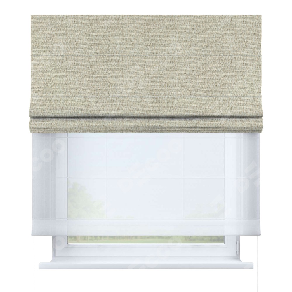 Римская штора день-ночь производителя «Cortin», используется для проёма, пошита из двух полотен, с лицевой стороны стиф димаут светло-бежевый артикул 18084, вторая ткань тюль (по стандарту комплектуется тюль белого цвета артикул V-01). Имеет универсальный механизм и подходит для монтажа: на потолок, на стену и в нишу.