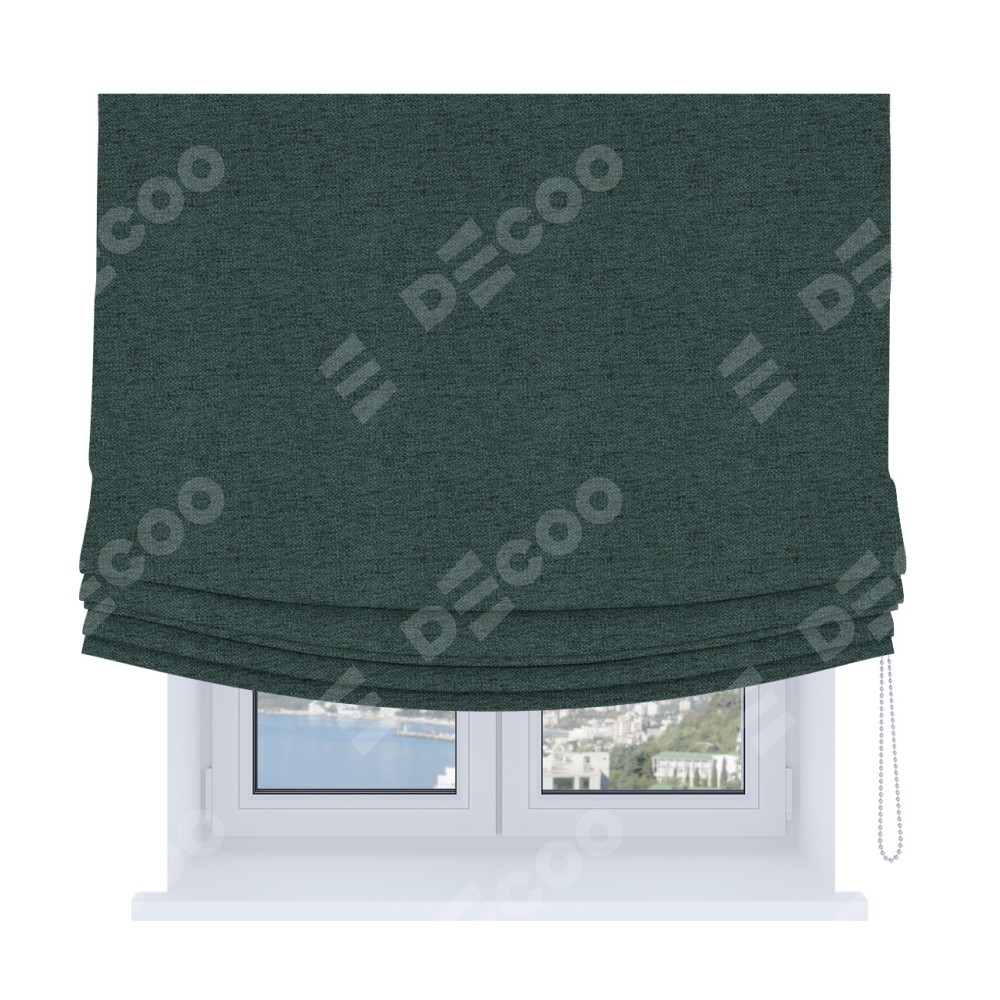 Римская штора Soft производителя «Cortin», используется для проёма, пошита из ткани стиф димаут сине-зелёный, артикул ткани 18194. Имеет универсальный механизм и подходит для монтажа: на потолок, на стену и в нишу. В отличие от стандартных римских штор, римская штора Soft не имеет горизонтальных вставок и нижнего отвеса. Это позволяет ткани произвольно драпироваться в свободные мягкие складки.