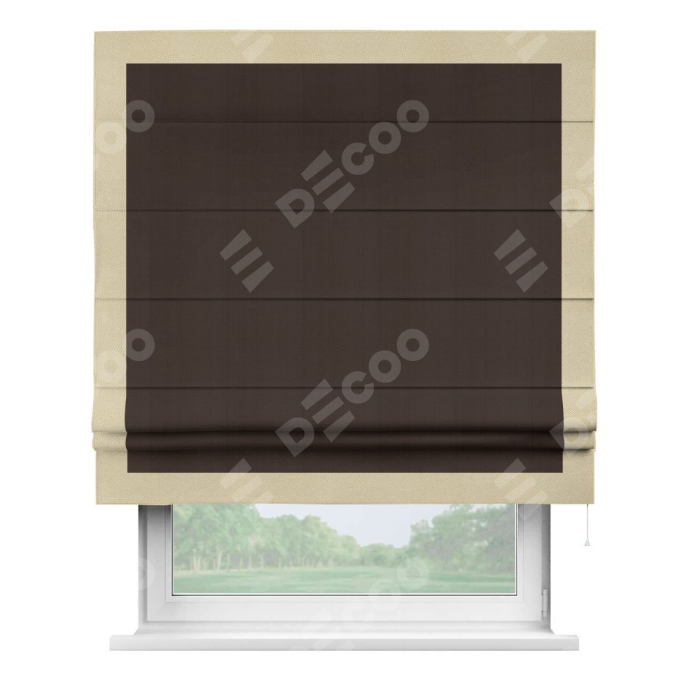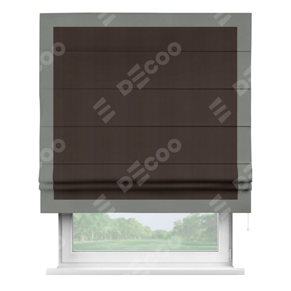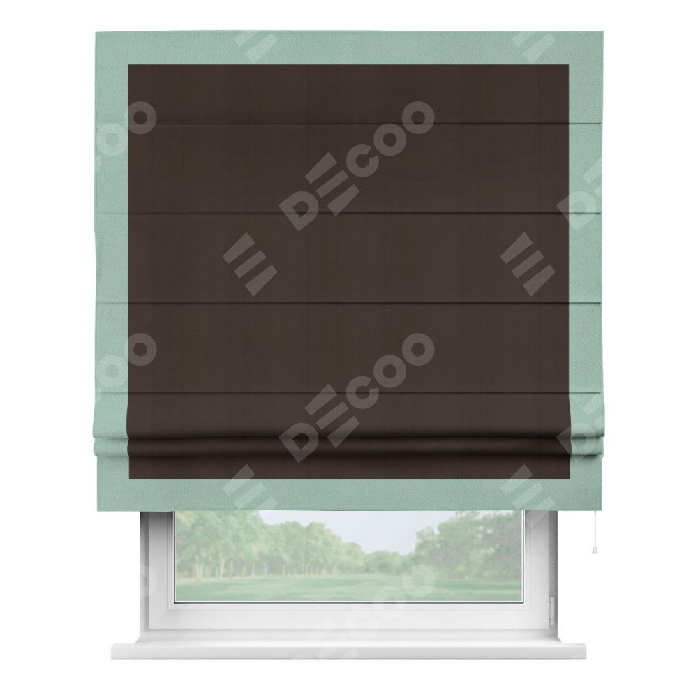Римская штора производителя «Cortin», используется для проёма, пошита из ткани блэкаут однотонный венге, артикул ткани 88286. Отделка шторы кантом «Чесс», ткань для канта используется из блэкаута однотонного разной расцветки на выбор. Имеет универсальный механизм и подходит для монтажа: на потолок, на стену и в нишу.