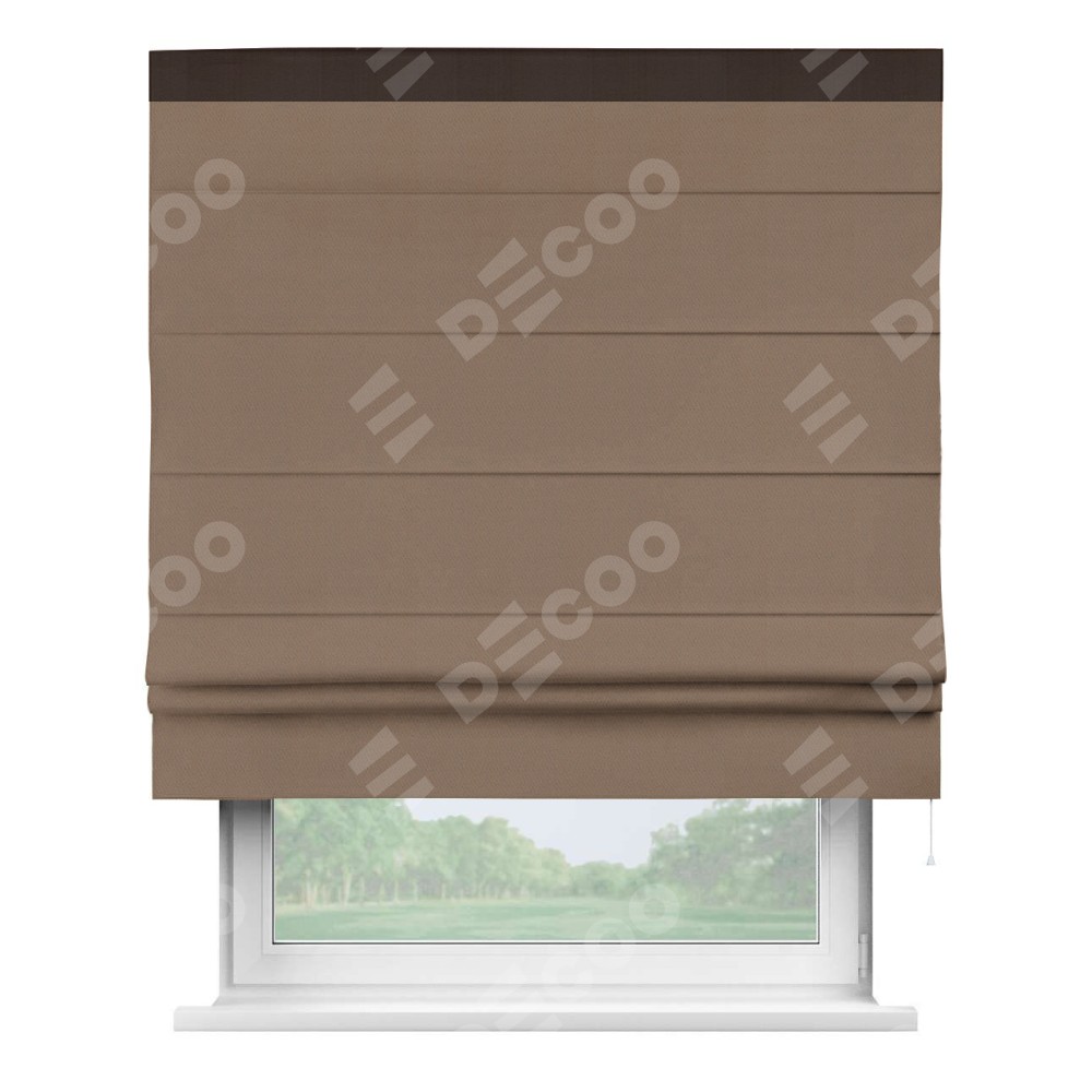 Римская штора производителя «Cortin», используется для проёма, пошита из ткани блэкаут однотонный коричневый, артикул ткани 88285. Отделка шторы кантом «Кинг», ткань для канта используется из блэкаута однотонного разной расцветки на выбор. Имеет универсальный механизм и подходит для монтажа: на потолок, на стену и в нишу.
