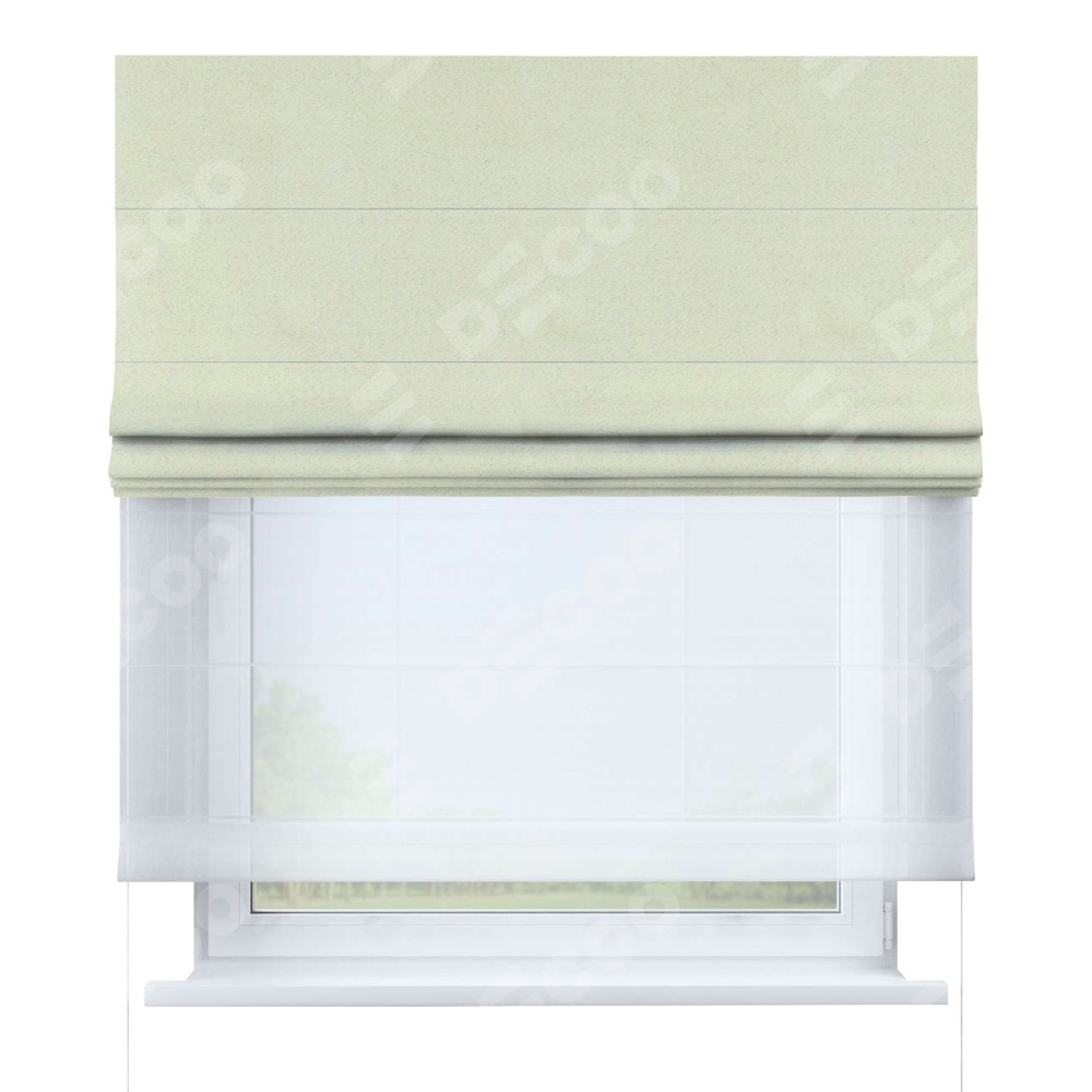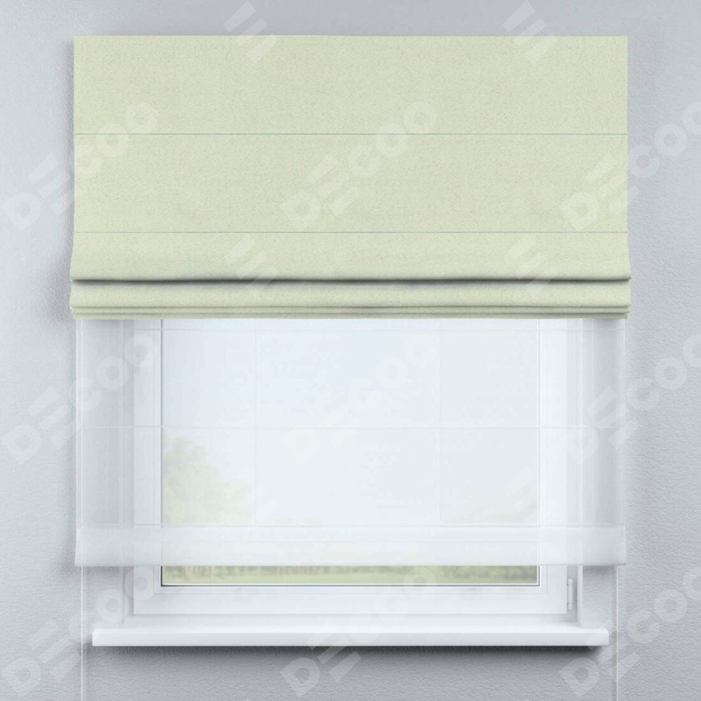 Римская штора день-ночь производителя «Cortin», используется для проёма, пошита из двух полотен, с лицевой стороны блэкаут однотонный сливочный артикул 6668−02, вторая ткань тюль (по стандарту комплектуется тюль белого цвета артикул V-01). Имеет универсальный механизм и подходит для монтажа: на потолок, на стену и в нишу.