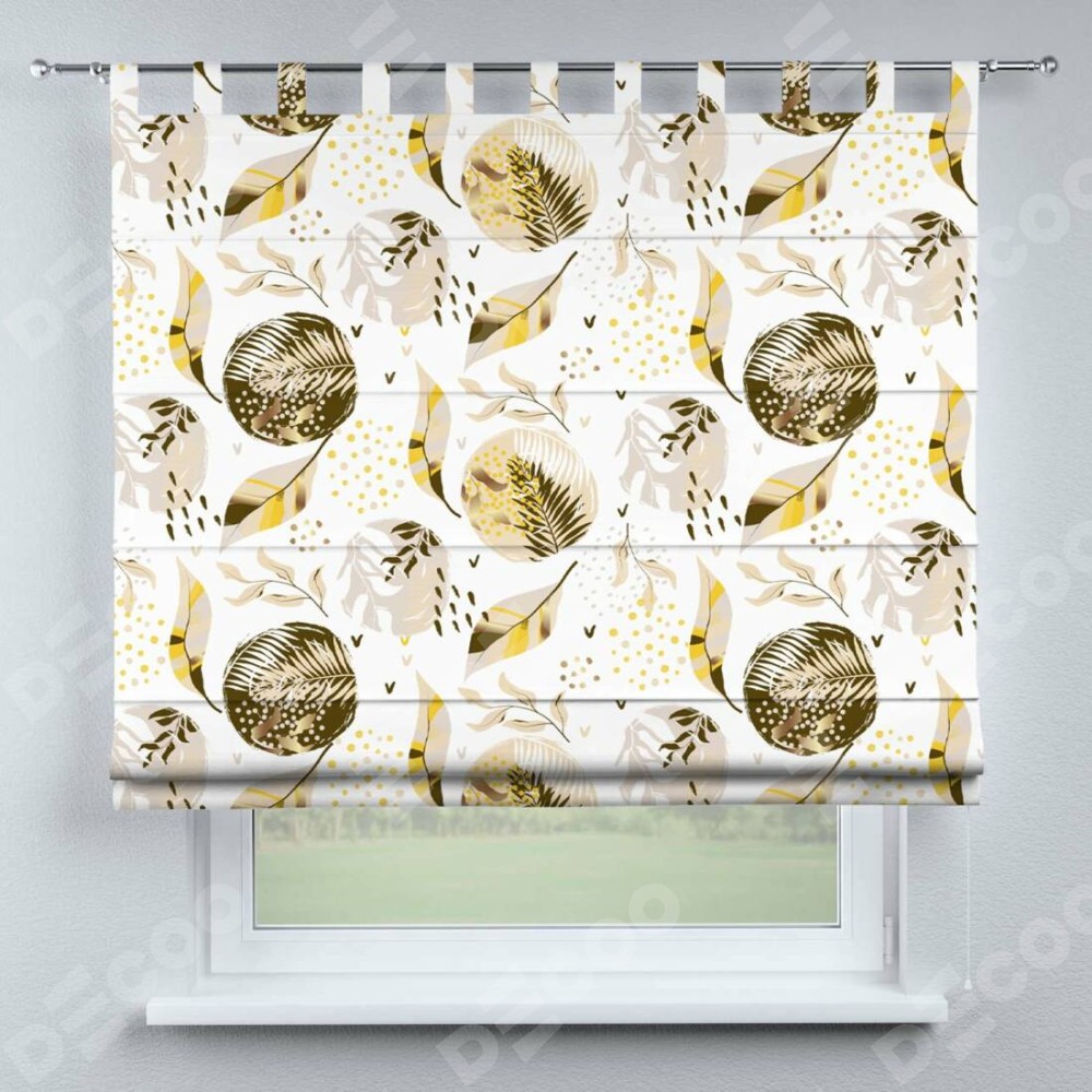 Римская штора производителя «Cortin», используется для проёма, пошита из ткани блэкаут с нанесением сублимационной печати «Золотые листья». Данная модель пошита на петлях, комплектуется на выбор круглым карнизом и подходит для монтажа на стену. Римская штора на петлях имеет простую систему регулировки высоты, отличительным преимуществом данной модели является простой способ монтажа. Достаточно повесить ее на трубу и штора готова!