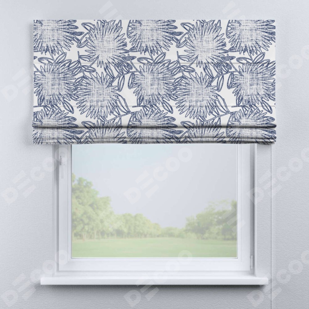 Римская штора производителя «Cortin», используется для проёма, пошита из ткани блэкаут с нанесением сублимационной печати «Синий букет». Имеет универсальный механизм и подходит для монтажа: на потолок, на стену и в нишу.