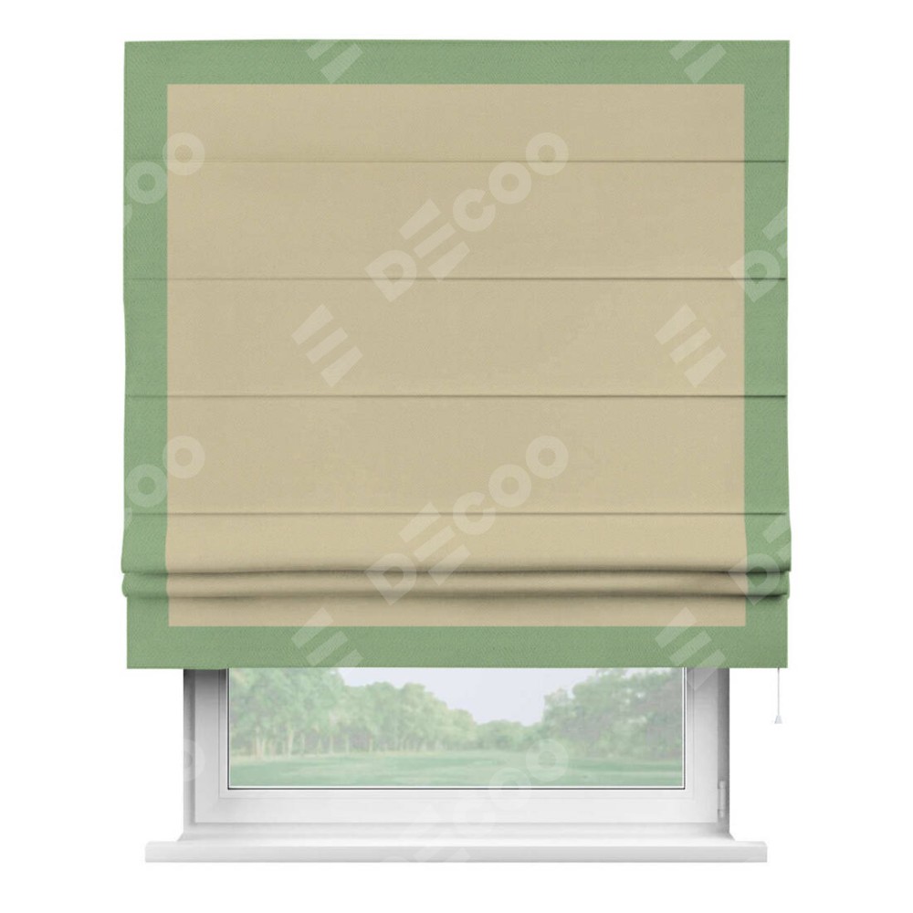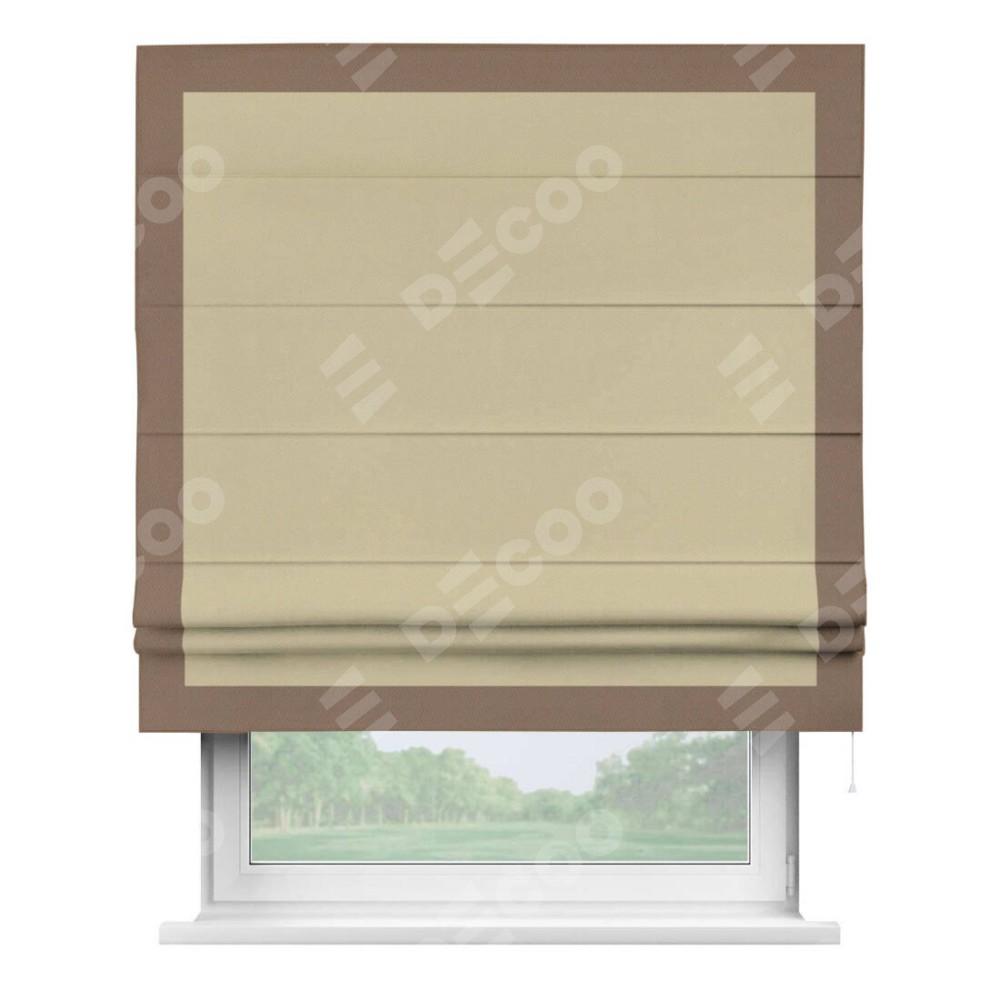 Римская штора производителя «Cortin», используется для проёма, пошита из ткани блэкаут однотонный кофейный, артикул ткани 13130. Отделка шторы кантом «Чесс», ткань для канта используется из блэкаута однотонного разной расцветки на выбор. Имеет универсальный механизм и подходит для монтажа: на потолок, на стену и в нишу.