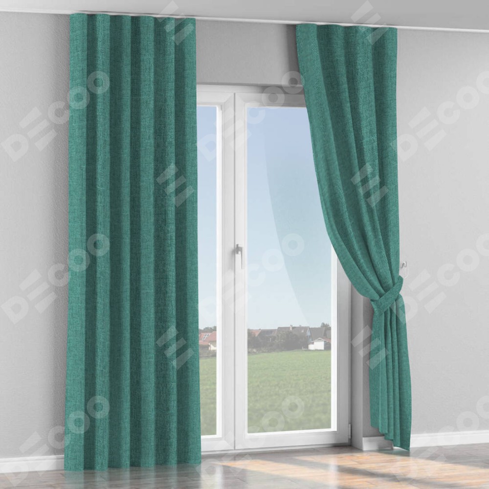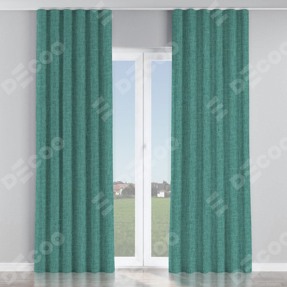 Комплект прямых штор, от производителя «Cortin», пошиты из ткани лён кашемир бирюзовый, артикул ткани 17214. С изнаночной стороны в верхней части штор пристрачивается шторная лента с декоративными складками «Волна». Для создания элегантных складок прямые шторы шьются по стандарту с коэффициентом 1:2 (на 100 см. ширины проёма 200 см. ширины ткани).