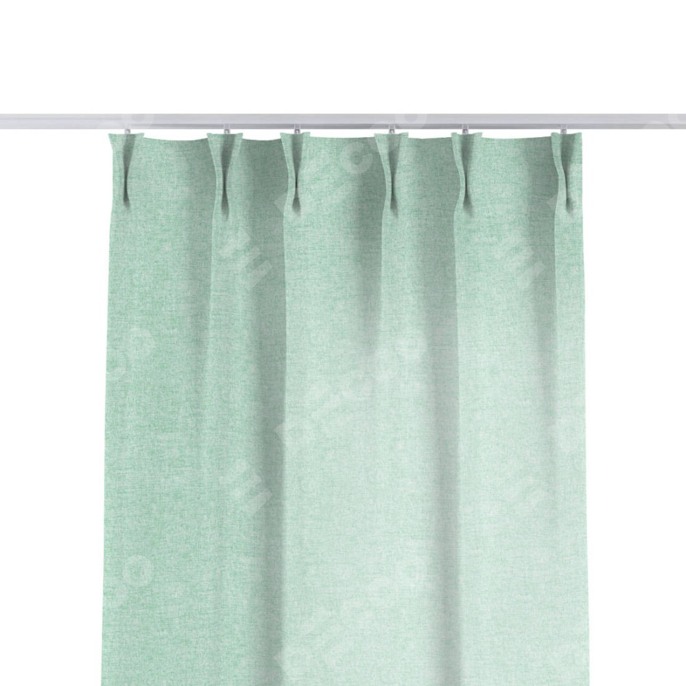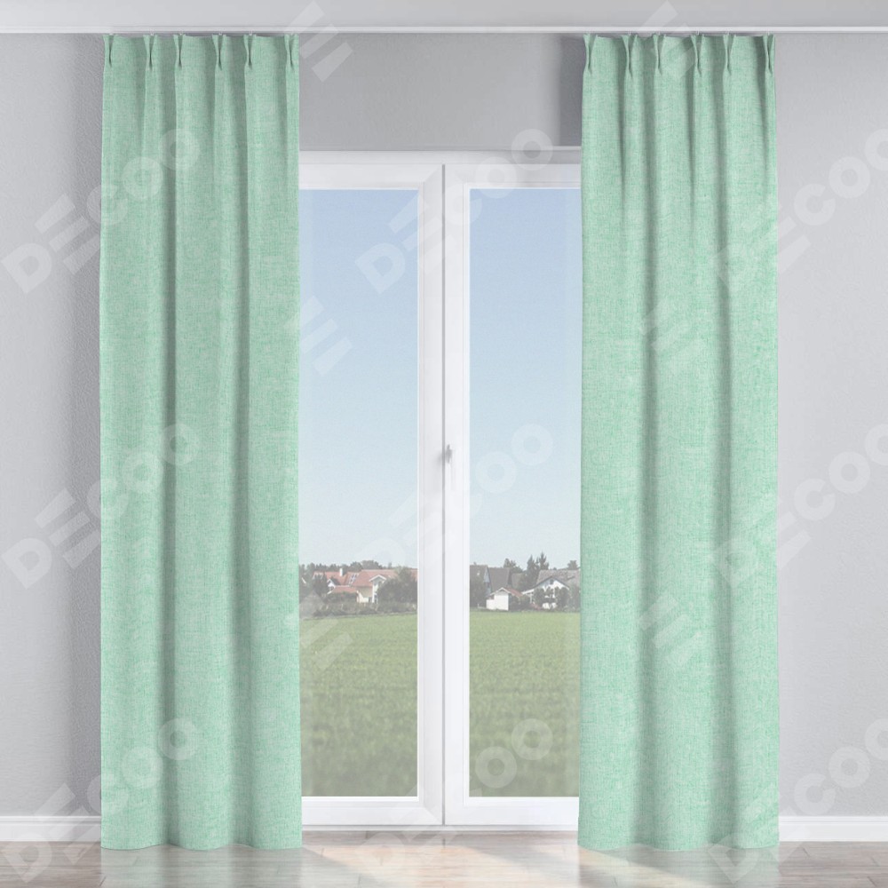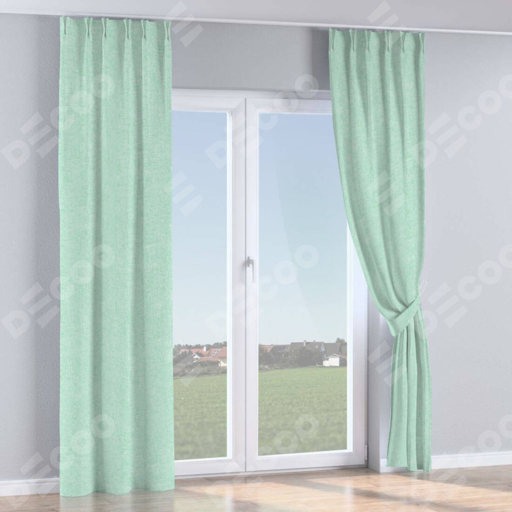 Комплект прямых штор, от производителя «Cortin», пошиты из ткани лён кашемир мятный, артикул ткани 21617. С изнаночной стороны в верхней части штор пристрачивается шторная лента с декоративными складками «Кустик». Для создания элегантных складок прямые шторы шьются по стандарту с коэффициентом 1:2 (на 100 см. ширины проёма 200 см. ширины ткани).