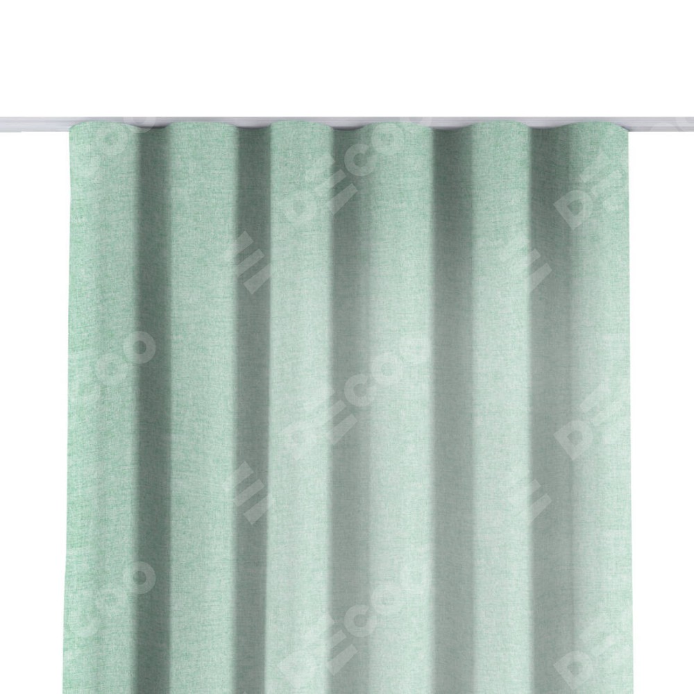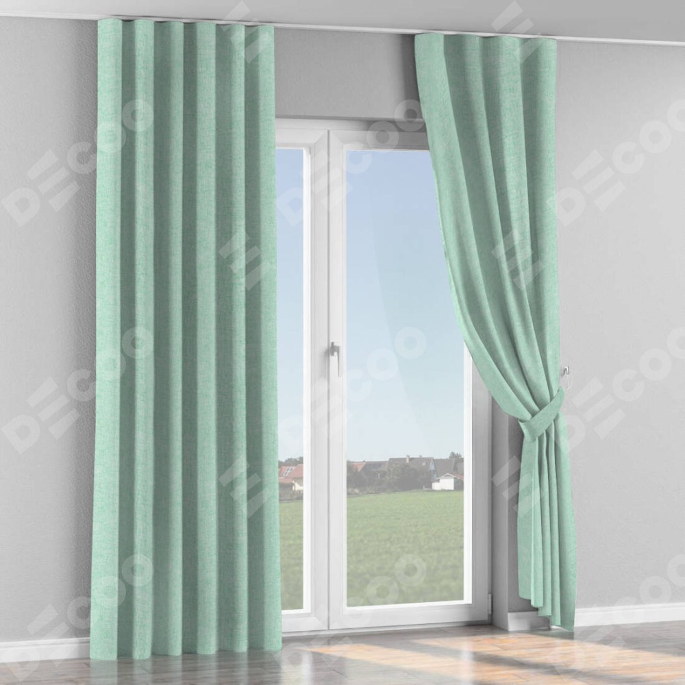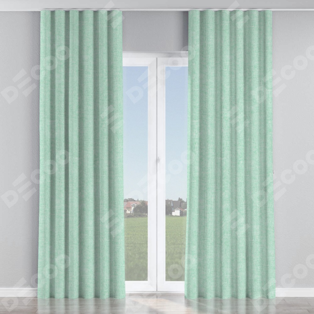 Комплект прямых штор, от производителя «Cortin», пошиты из ткани лён кашемир мятный, артикул ткани 21617. С изнаночной стороны в верхней части штор пристрачивается шторная лента с декоративными складками «Волна». Для создания элегантных складок прямые шторы шьются по стандарту с коэффициентом 1:2 (на 100 см. ширины проёма 200 см. ширины ткани).