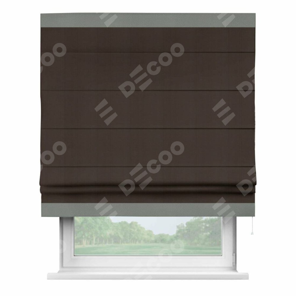Римская штора производителя «Cortin», используется для проёма, пошита из ткани блэкаут однотонный тёмно-коричневый, артикул ткани 88287. Отделка шторы кантом «Горизонт», ткань для канта используется из блэкаута однотонного разной расцветки на выбор. Имеет универсальный механизм и подходит для монтажа: на потолок, на стену и в нишу.