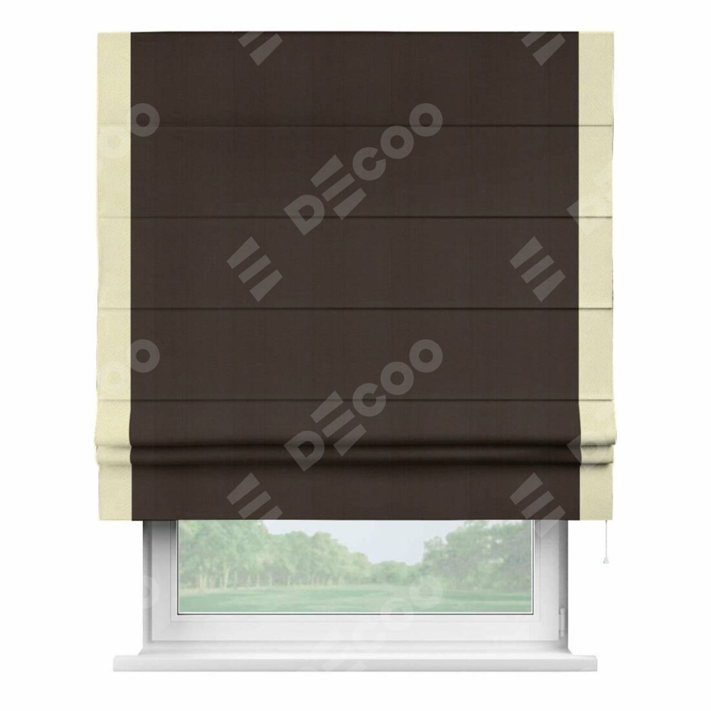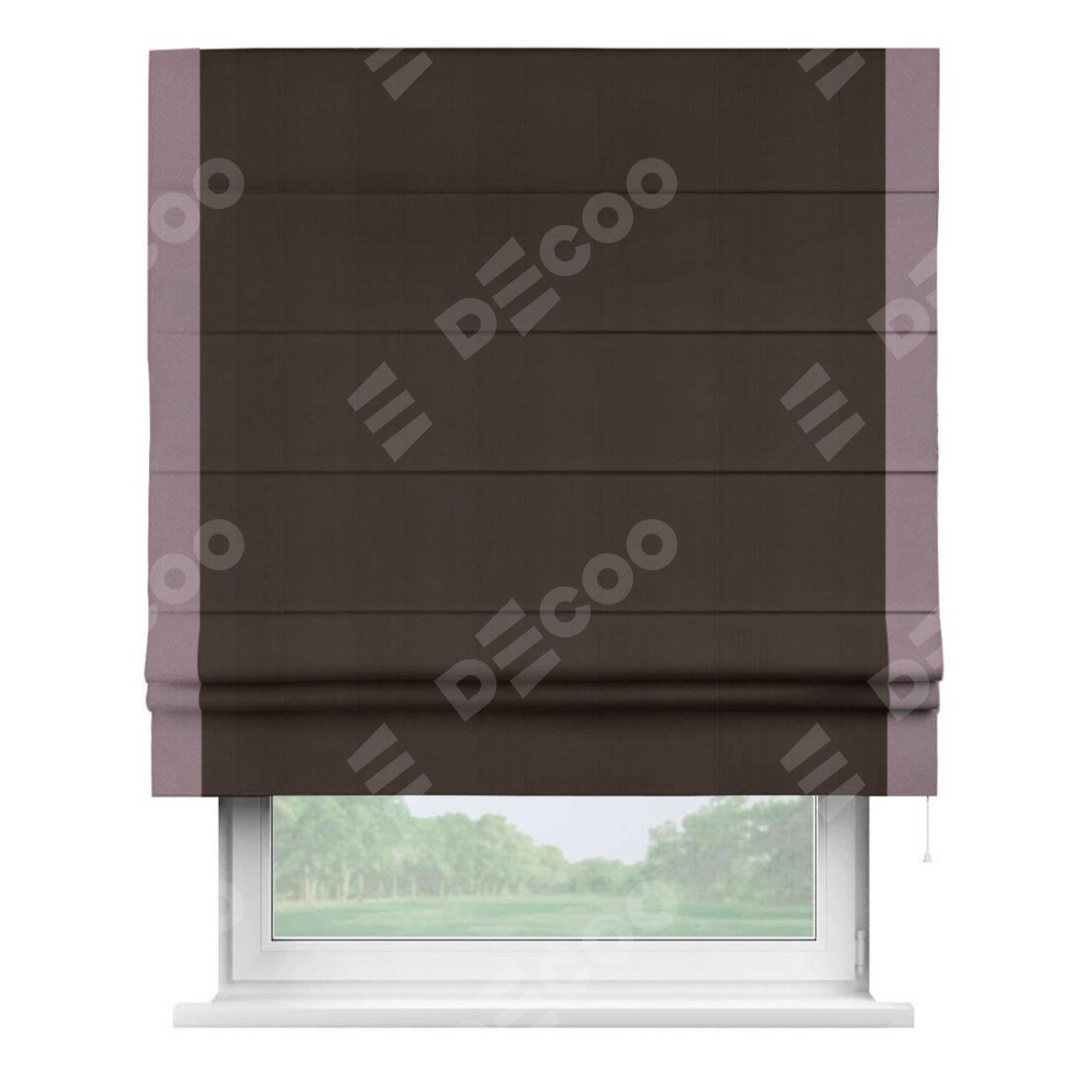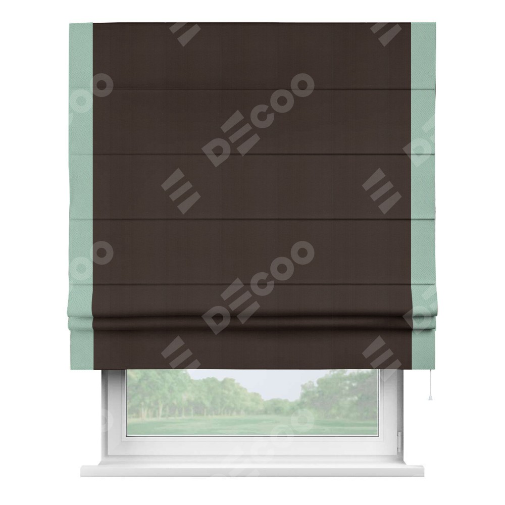 Римская штора производителя «Cortin», используется для проёма, пошита из ткани блэкаут однотонный тёмно-коричневый, артикул ткани 88287. Отделка шторы кантом «Стрим Дуо», ткань для канта используется из блэкаута однотонного разной расцветки на выбор. Имеет универсальный механизм и подходит для монтажа: на потолок, на стену и в нишу.