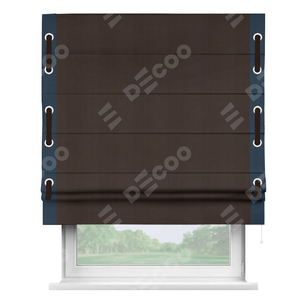 Римская штора производителя «Cortin», используется для проёма, пошита из ткани блэкаут однотонный тёмно-коричневый, артикул ткани 88287. Отделка шторы кантом «Стрим Дуо» на кантах расположены люверсы с пояском, ткань для канта используется из блэкаута однотонного разной расцветки на выбор. Ткань для пояска обычно используется из основной ткани шторы, а так же можно сделать из любой расцветки по желанию. Имеет универсальный механизм и подходит для монтажа: на потолок, на стену и в нишу.