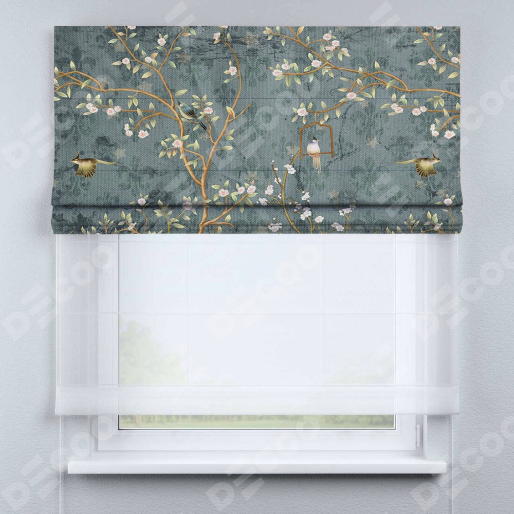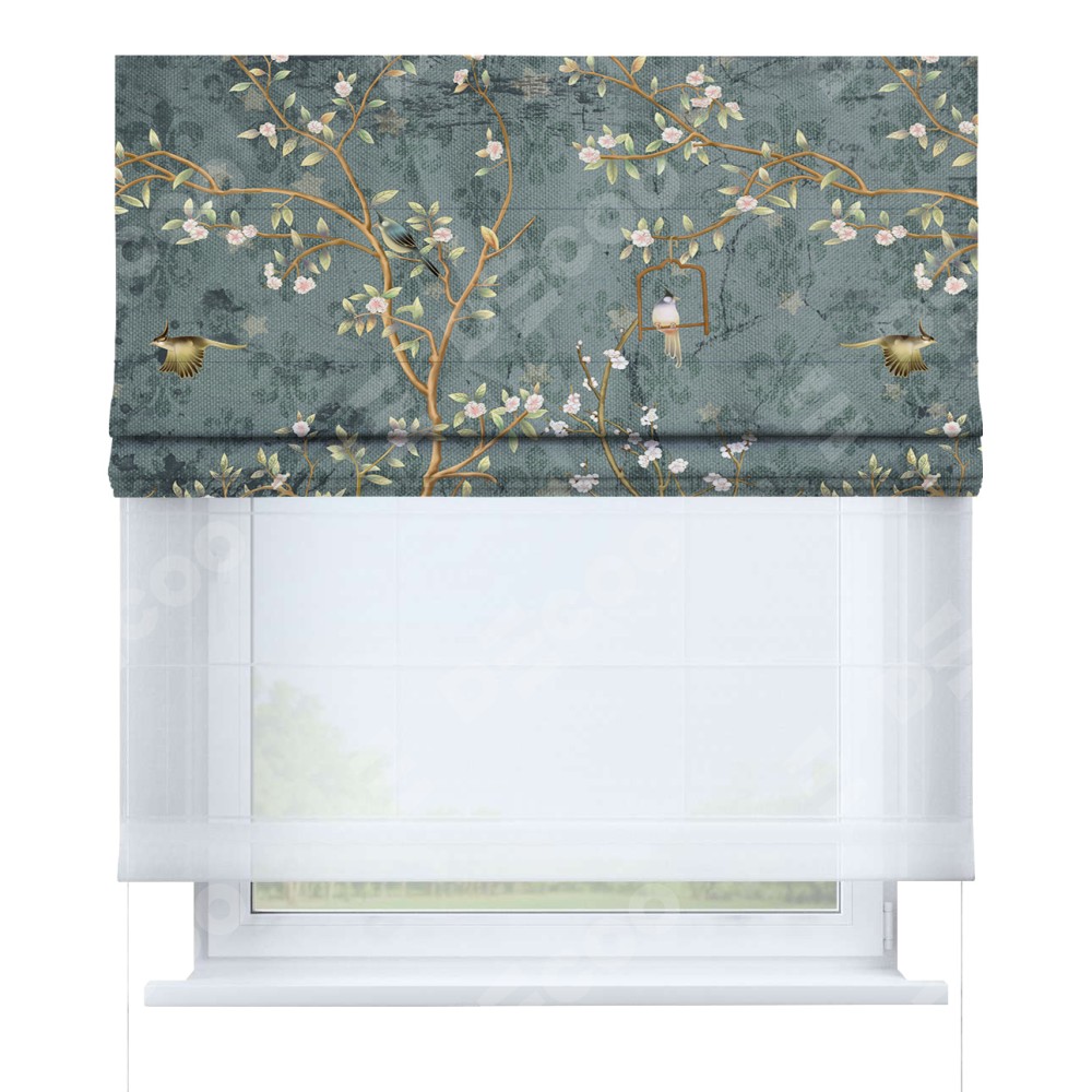 Римская штора день-ночь производителя «Cortin», используется для проёма, пошита из двух полотен, с лицевой блэкаут с нанесением сублимационной печати «Тенистый сад», вторая ткань тюль (по стандарту комплектуется тюль белого цвета артикул V-01). Имеет универсальный механизм и подходит для монтажа: на потолок, на стену и в нишу.