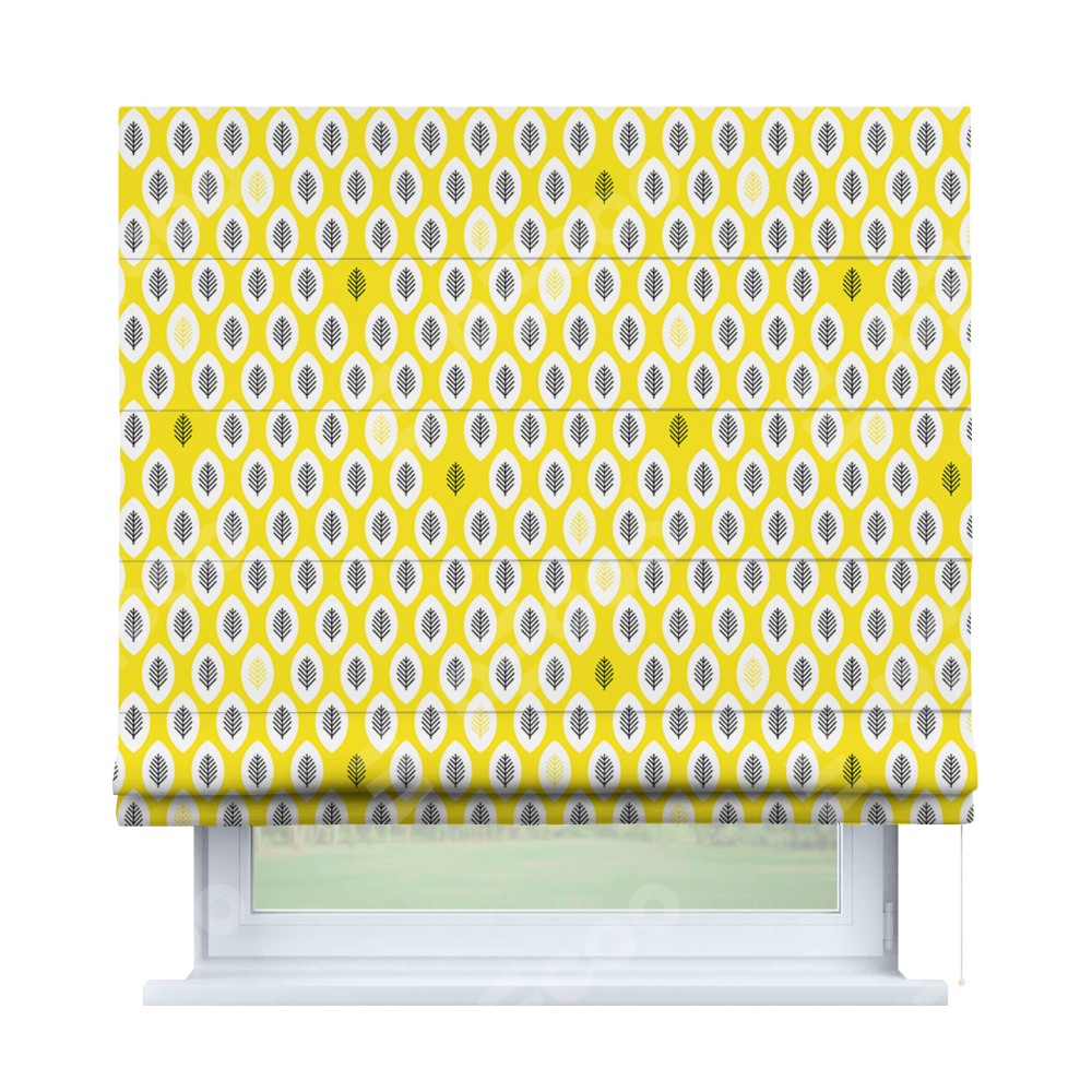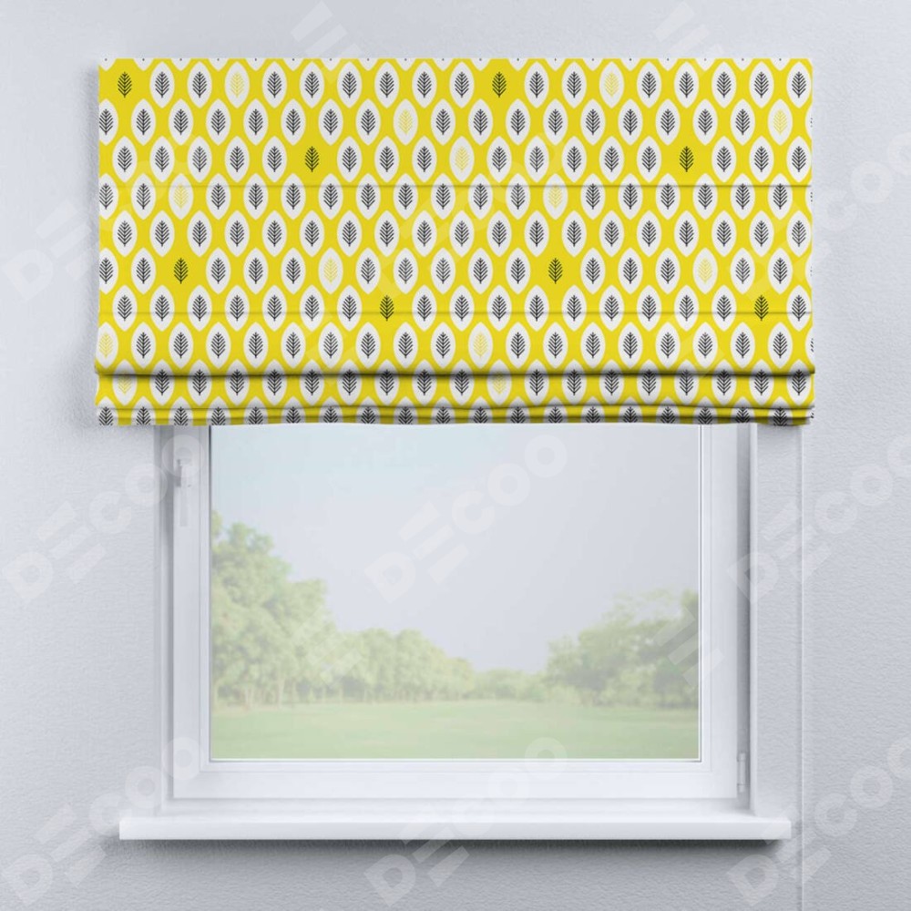 Римская штора производителя «Cortin», используется для проёма, пошита из ткани блэкаут с нанесением сублимационной печати «Солнечные листья». Имеет универсальный механизм и подходит для монтажа: на потолок, на стену и в нишу.