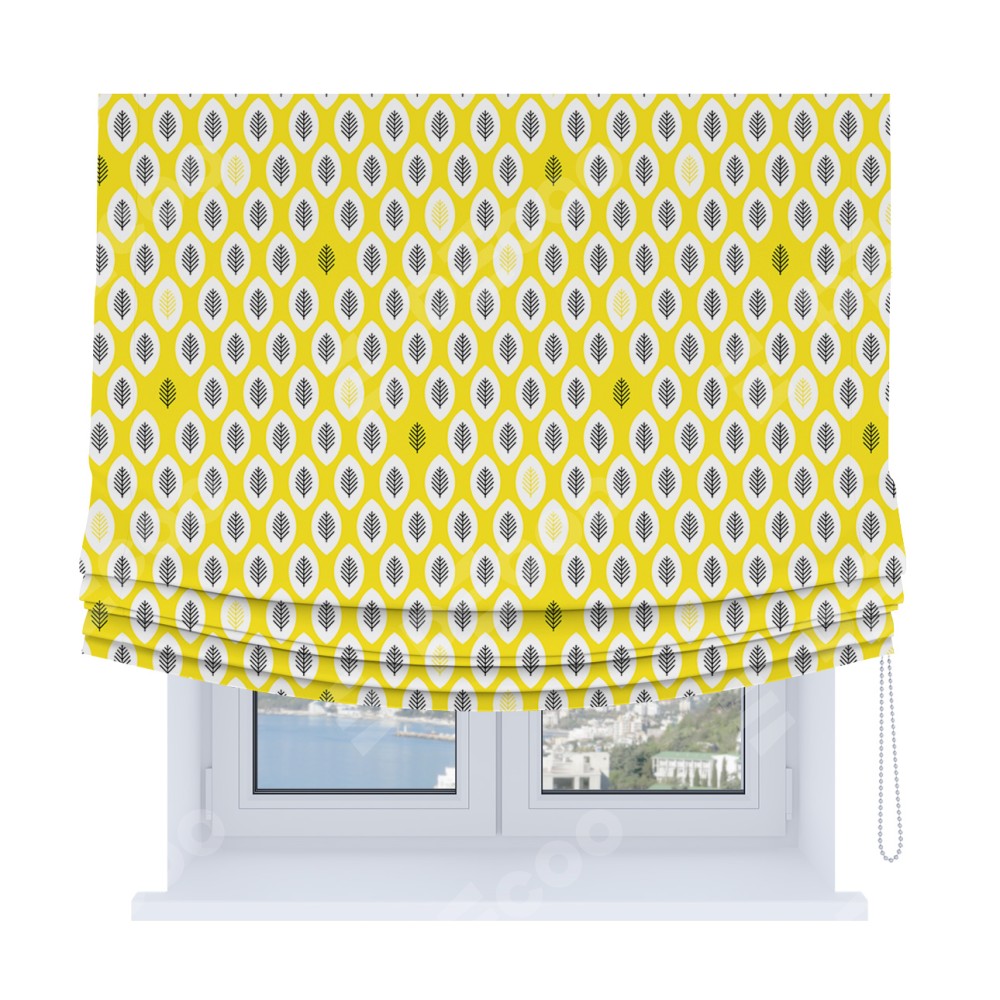 Римская штора Soft производителя «Cortin», используется для проёма, пошита из ткани блэкаут с нанесением сублимационной печати «Солнечные листья». Имеет универсальный механизм и подходит для монтажа: на потолок, на стену и в нишу. В отличие от стандартных римских штор, римская штора Soft не имеет горизонтальных вставок и нижнего отвеса. Это позволяет ткани произвольно драпироваться в свободные мягкие складки.