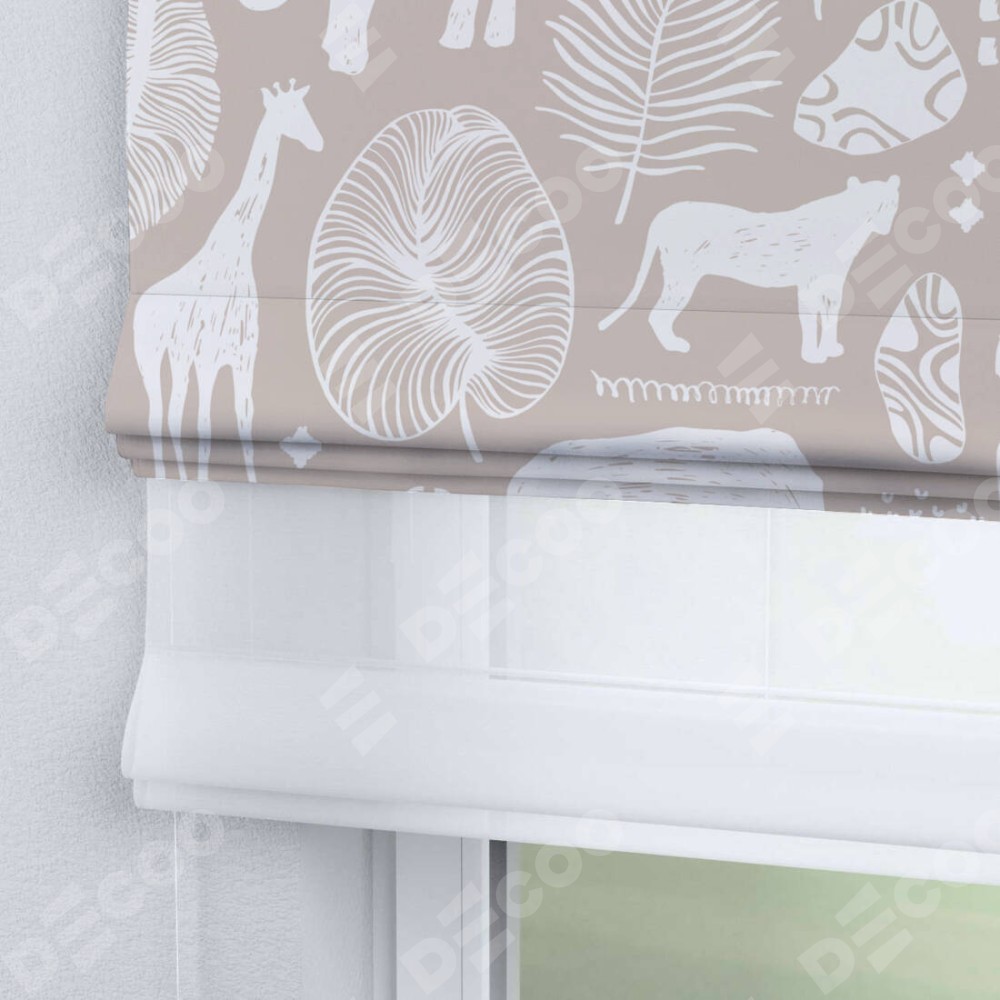Римская штора день-ночь производителя «Cortin», используется для проёма, пошита из двух полотен, с лицевой блэкаут с нанесением сублимационной печати «Африканские животные», вторая ткань тюль (по стандарту комплектуется тюль белого цвета артикул V-01). Имеет универсальный механизм и подходит для монтажа: на потолок, на стену и в нишу.