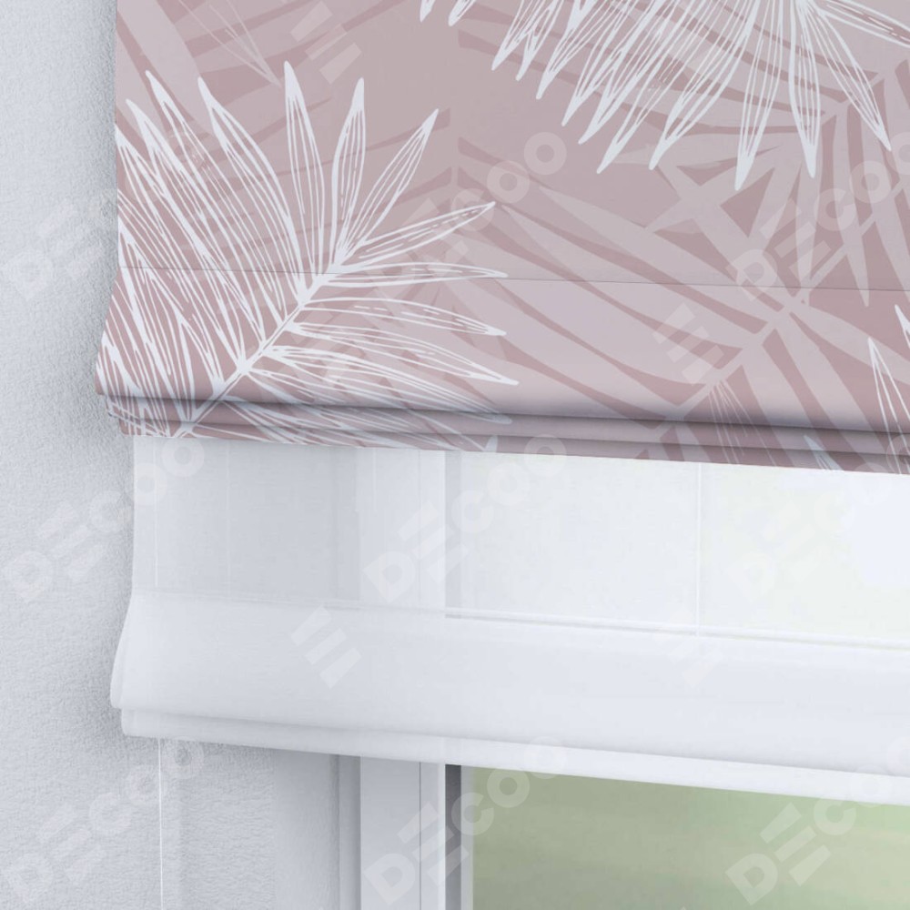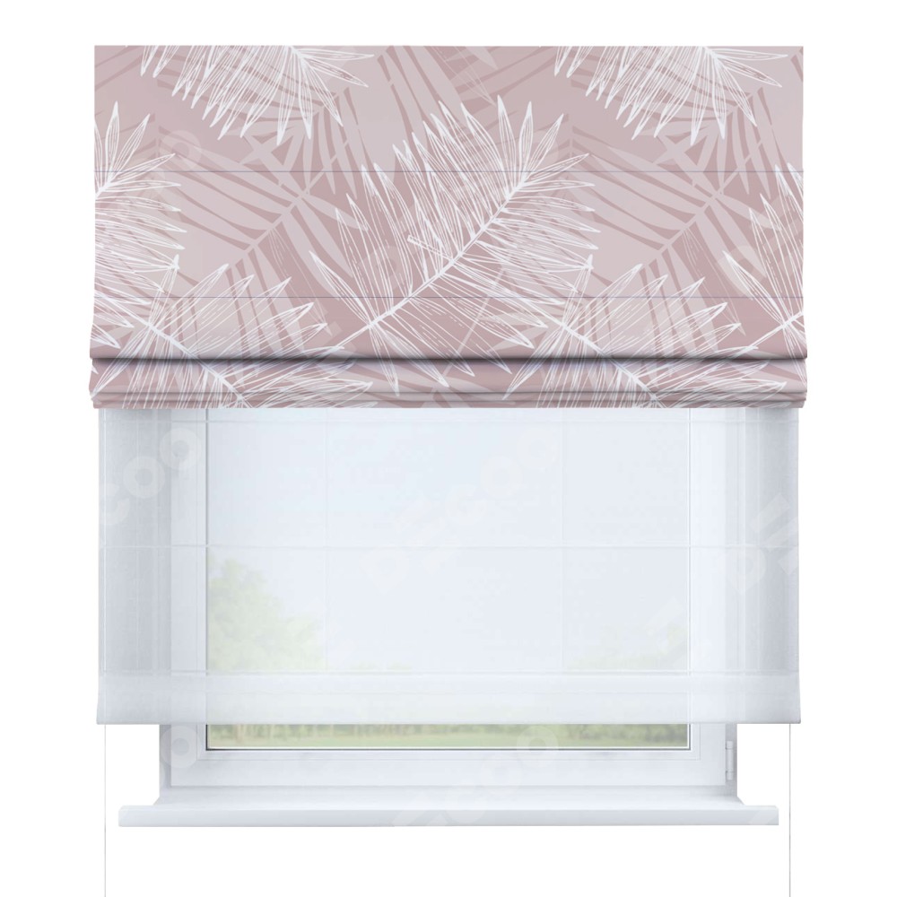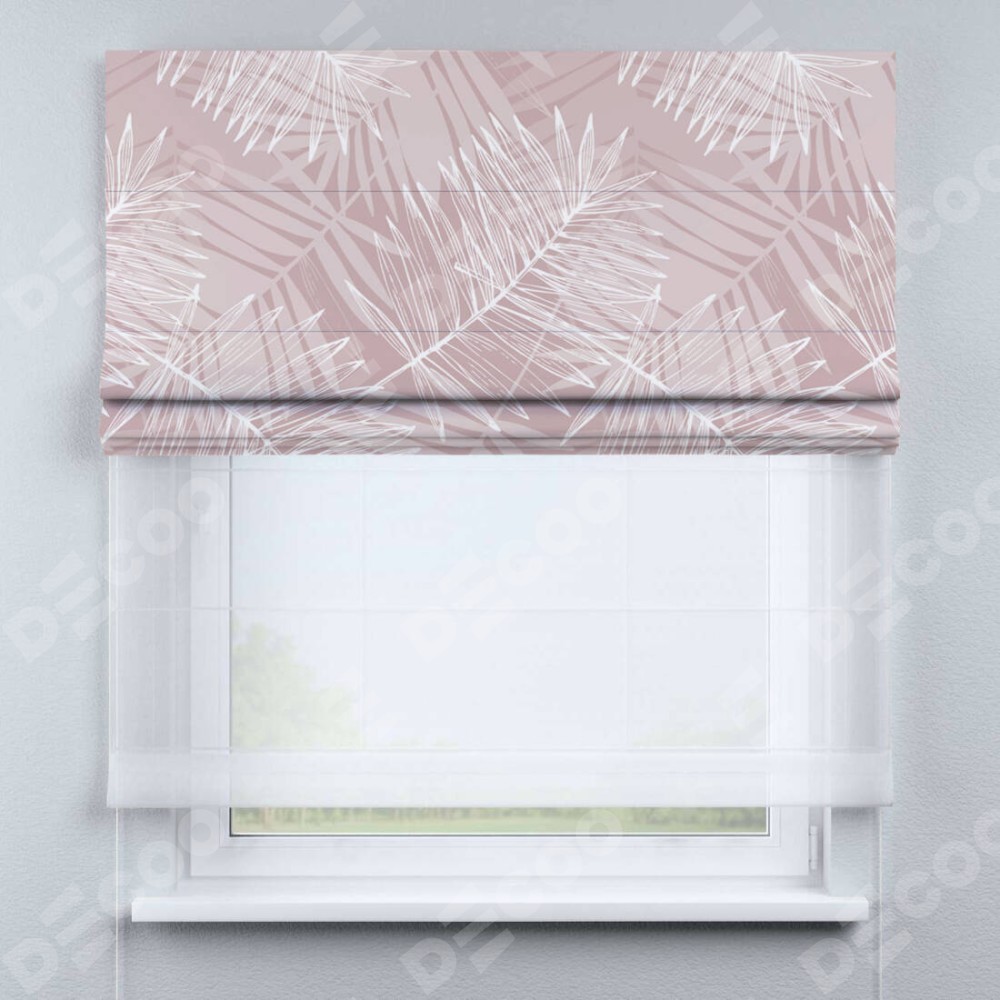Римская штора день-ночь производителя «Cortin», используется для проёма, пошита из двух полотен, с лицевой блэкаут с нанесением сублимационной печати «Бежевые тропики», вторая ткань тюль (по стандарту комплектуется тюль белого цвета артикул V-01). Имеет универсальный механизм и подходит для монтажа: на потолок, на стену и в нишу.