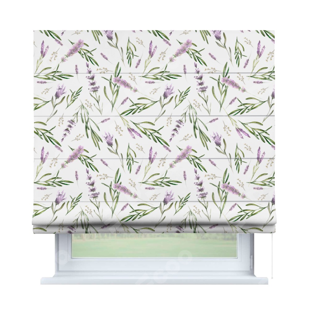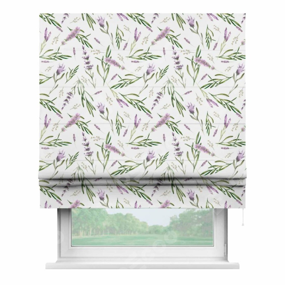 Римская штора производителя «Cortin», используется для проёма, пошита из ткани блэкаут с нанесением сублимационной печати «Лавандовое поле». Имеет универсальный механизм и подходит для монтажа: на потолок, на стену и в нишу.