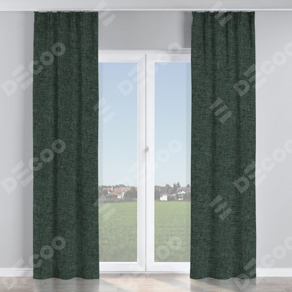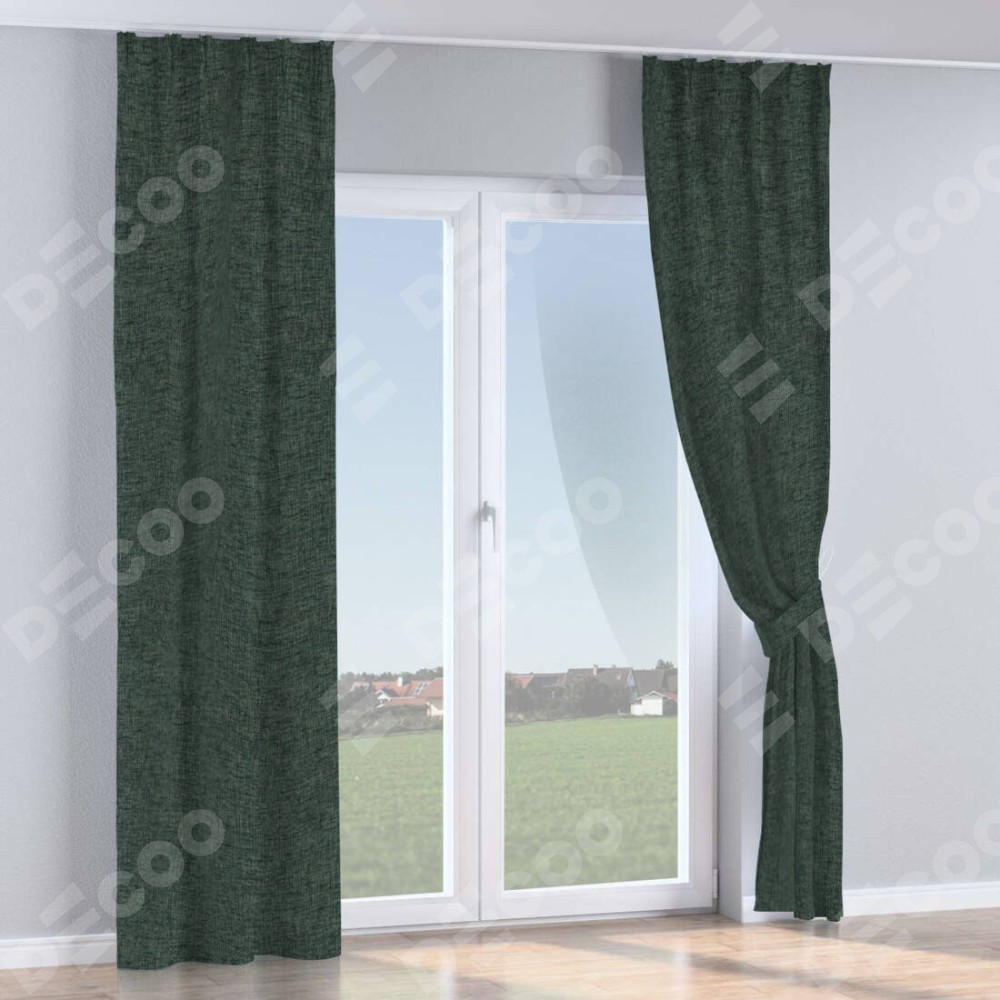 Комплект прямых штор, от производителя «Cortin», пошиты из ткани рогожка димаут графит, артикул ткани 102−34. С изнаночной стороны в верхней части штор пристрачивается шторная лента с декоративными складками «Кустик». Для создания элегантных складок прямые шторы шьются по стандарту с коэффициентом 1:2 (на 100 см. ширины проёма 200 см. ширины ткани).