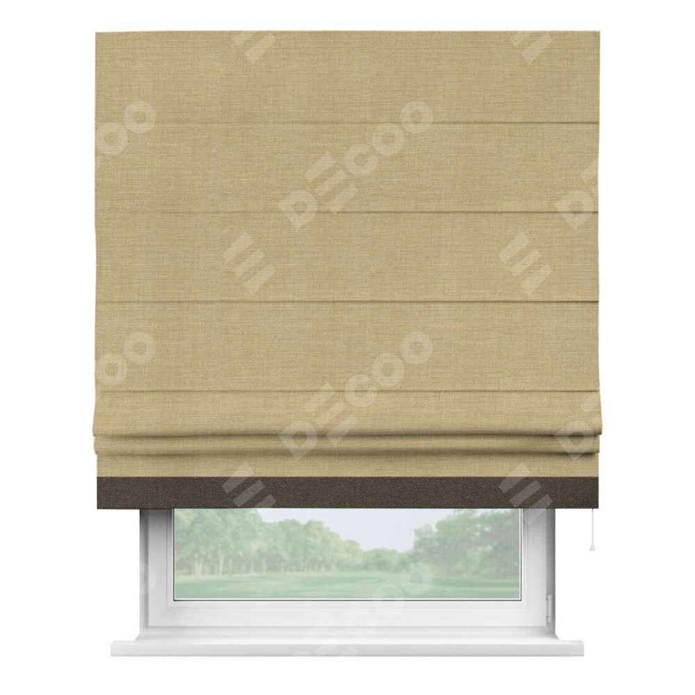Римская штора производителя «Cortin», используется для проёма, пошита из ткани лён бежевый, артикул 7442. Отделка шторы кантом «Джестер», ткань для канта используется из льна разной расцветки на выбор. Имеет универсальный механизм и подходит для монтажа: на потолок, на стену и в нишу.