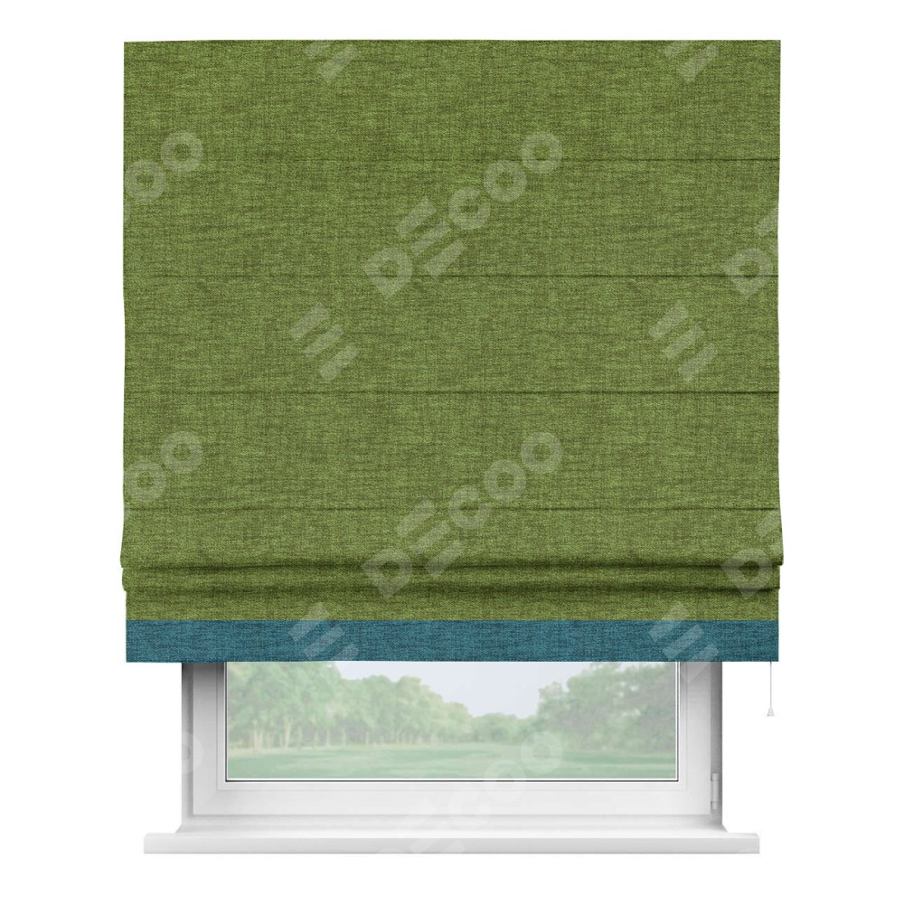 Римская штора производителя «Cortin», используется для проёма, пошита из ткани рогожка димаут салатовый, артикул 80423. Отделка шторы кантом «Джестер», ткань для канта используется из рогожки димаут разной расцветки на выбор. Имеет универсальный механизм и подходит для монтажа: на потолок, на стену и в нишу.