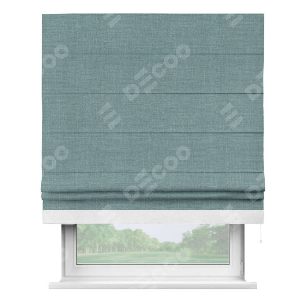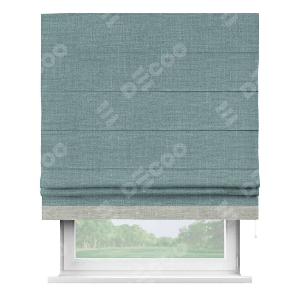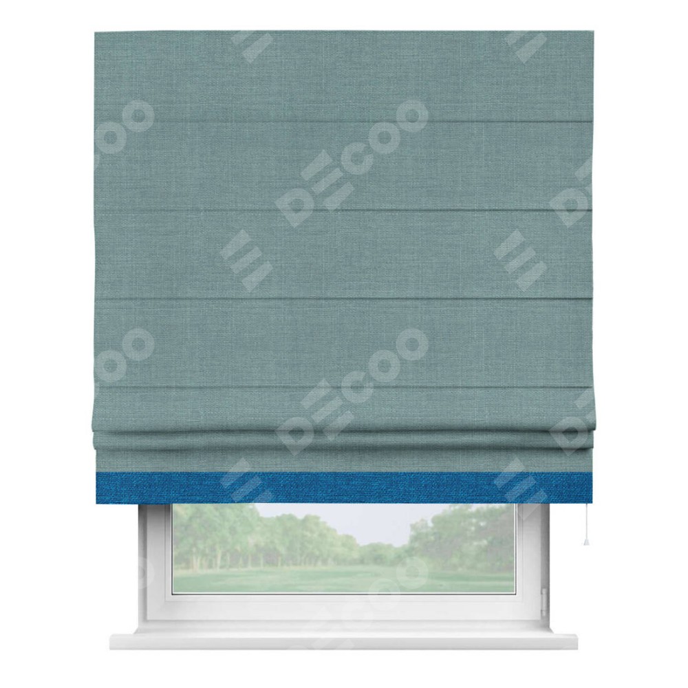 Римская штора производителя «Cortin», используется для проёма, пошита из ткани лён голубой, артикул 74736. Отделка шторы кантом «Джестер», ткань для канта используется из льна разной расцветки на выбор. Имеет универсальный механизм и подходит для монтажа: на потолок, на стену и в нишу.
