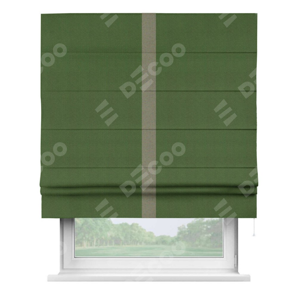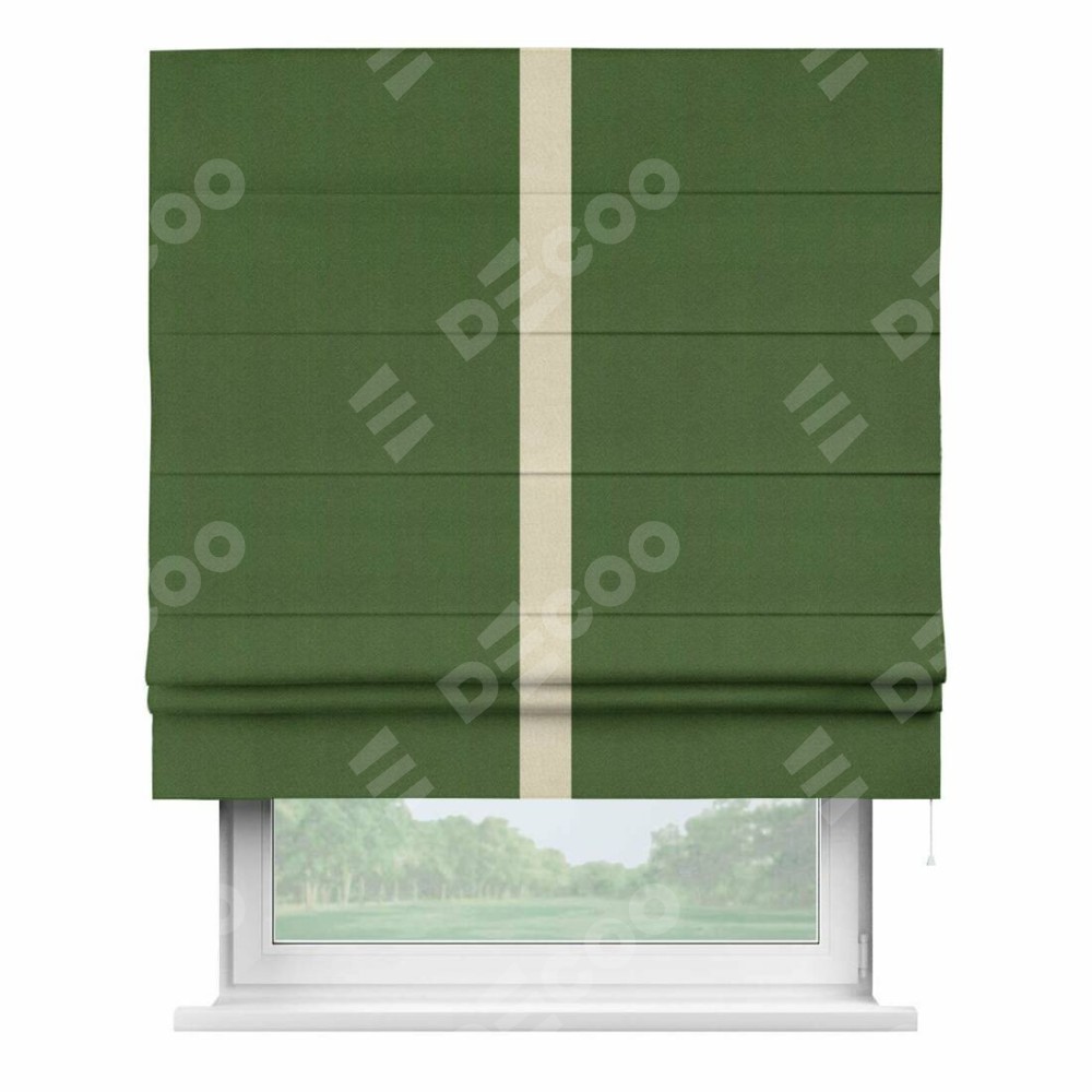 Римская штора производителя «Cortin», используется для проёма, пошита из ткани блэкаут однотонный зелёный перламутр, артикул ткани 81859−2. Отделка шторы кантом «Хайвей», ткань для канта используется из блэкаута однотонного разной расцветки на выбор. Имеет универсальный механизм и подходит для монтажа: на потолок, на стену и в нишу.