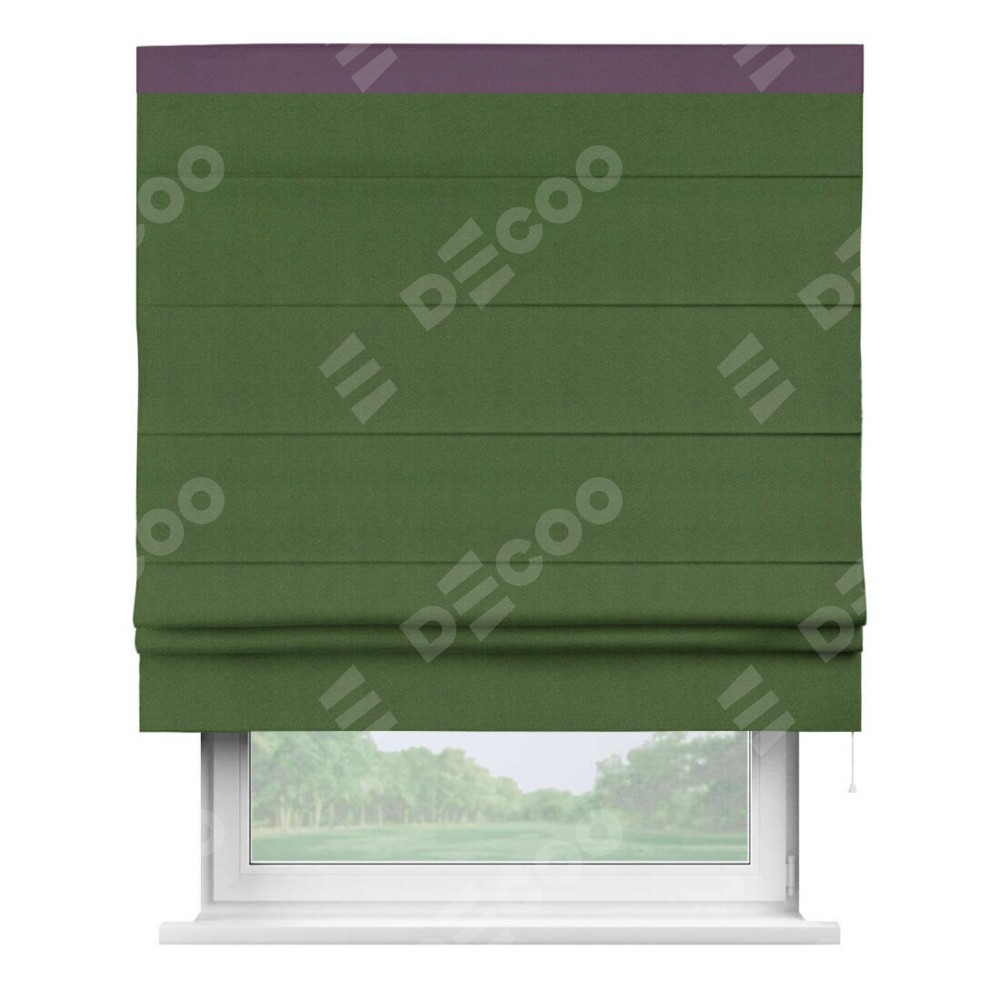 Римская штора производителя «Cortin», используется для проёма, пошита из ткани блэкаут однотонный зелёный перламутр, артикул ткани 81859−2. Отделка шторы кантом «Кинг», ткань для канта используется из блэкаута однотонного разной расцветки на выбор. Имеет универсальный механизм и подходит для монтажа: на потолок, на стену и в нишу.