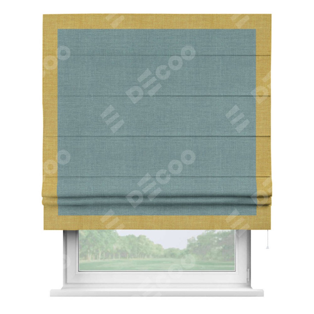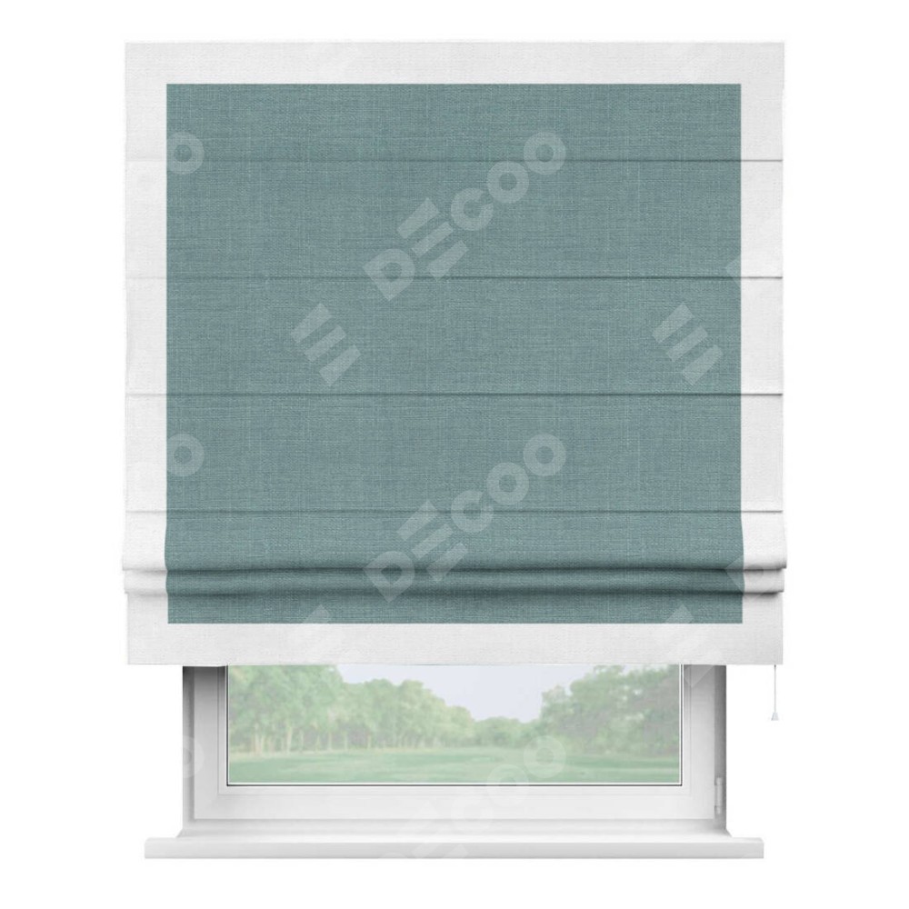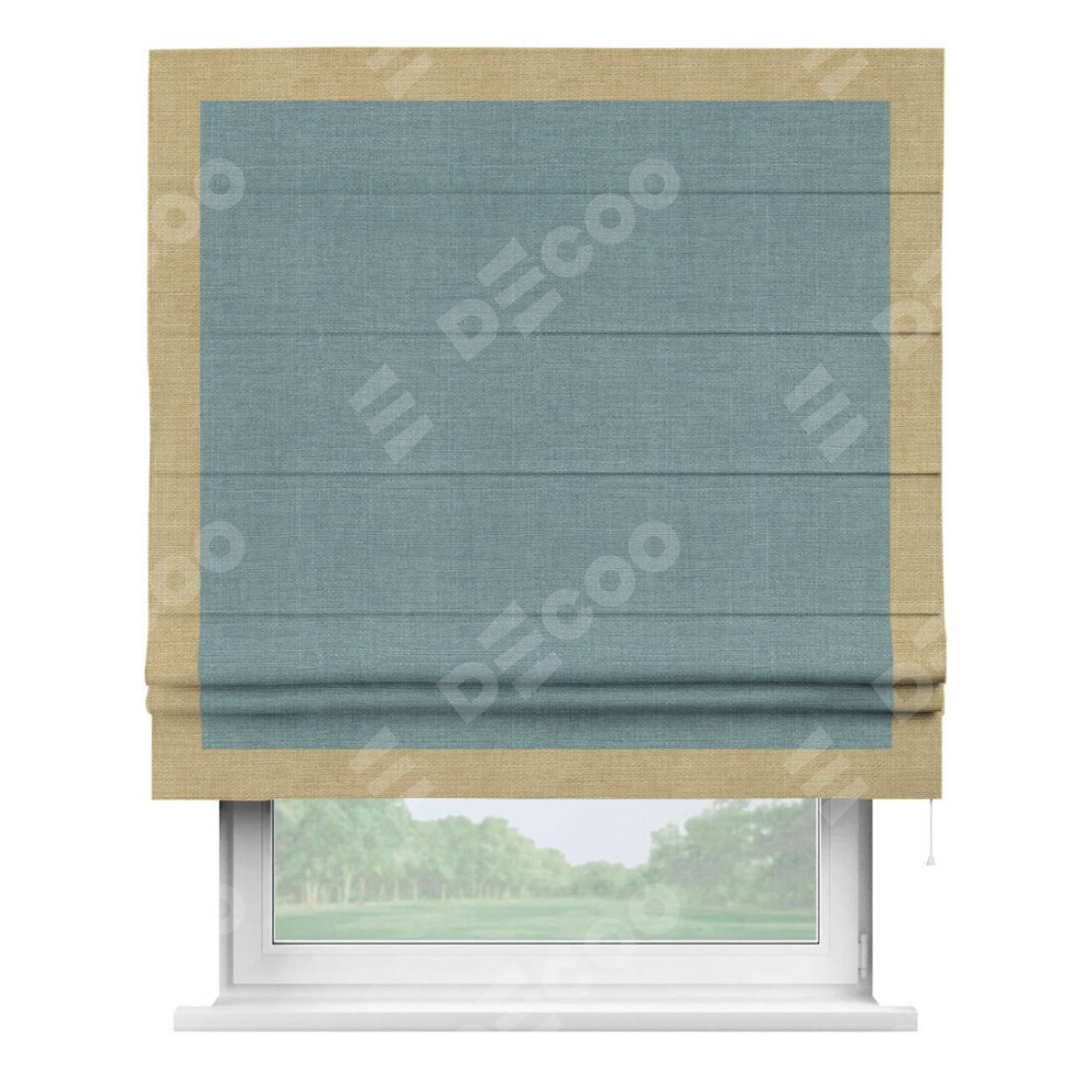 Римская штора производителя «Cortin», используется для проёма, пошита из ткани лён голубой, артикул 74736. Отделка шторы кантом «Чесс», ткань для канта используется из льна разной расцветки на выбор. Имеет универсальный механизм и подходит для монтажа: на потолок, на стену и в нишу.