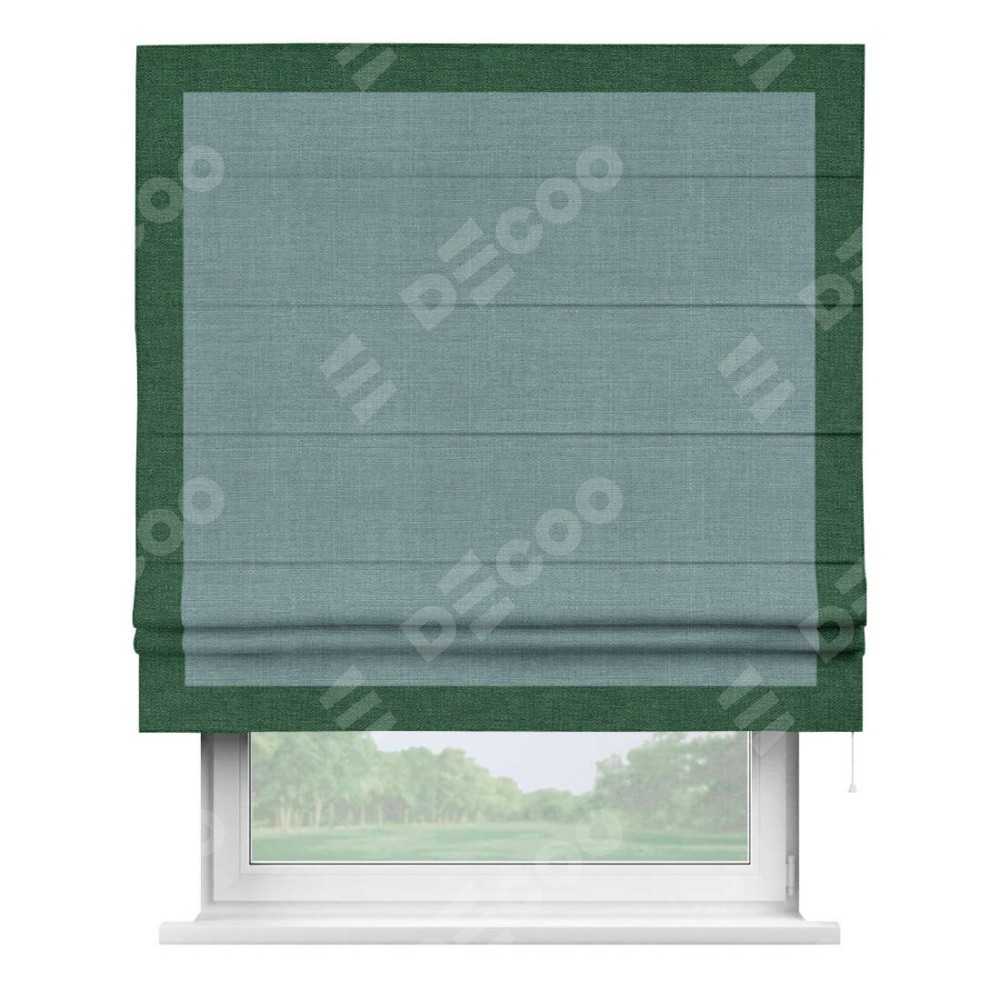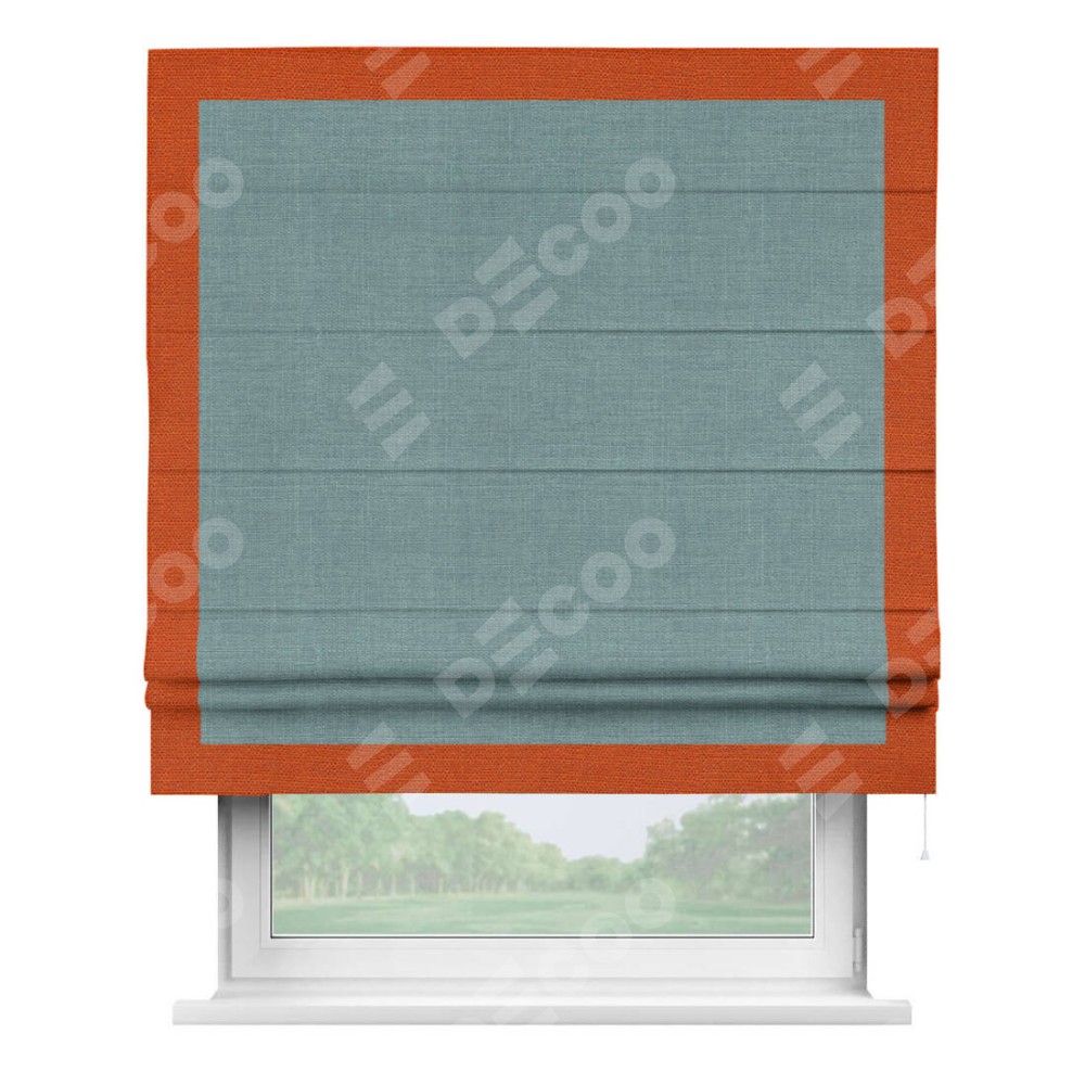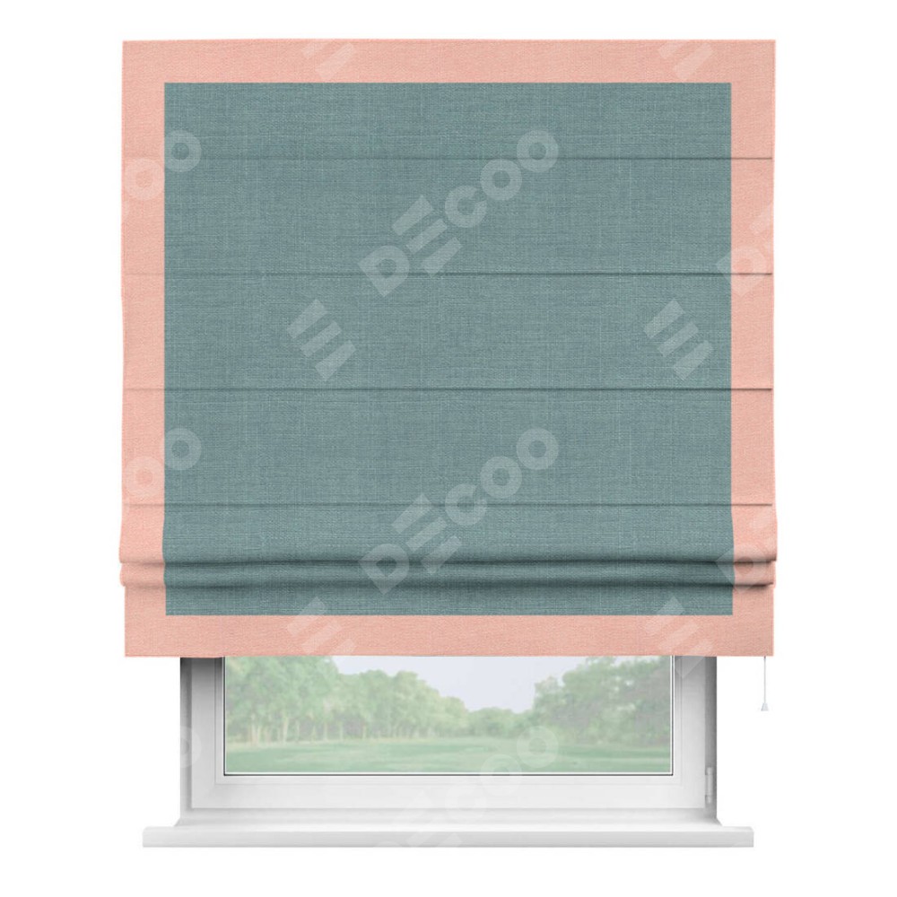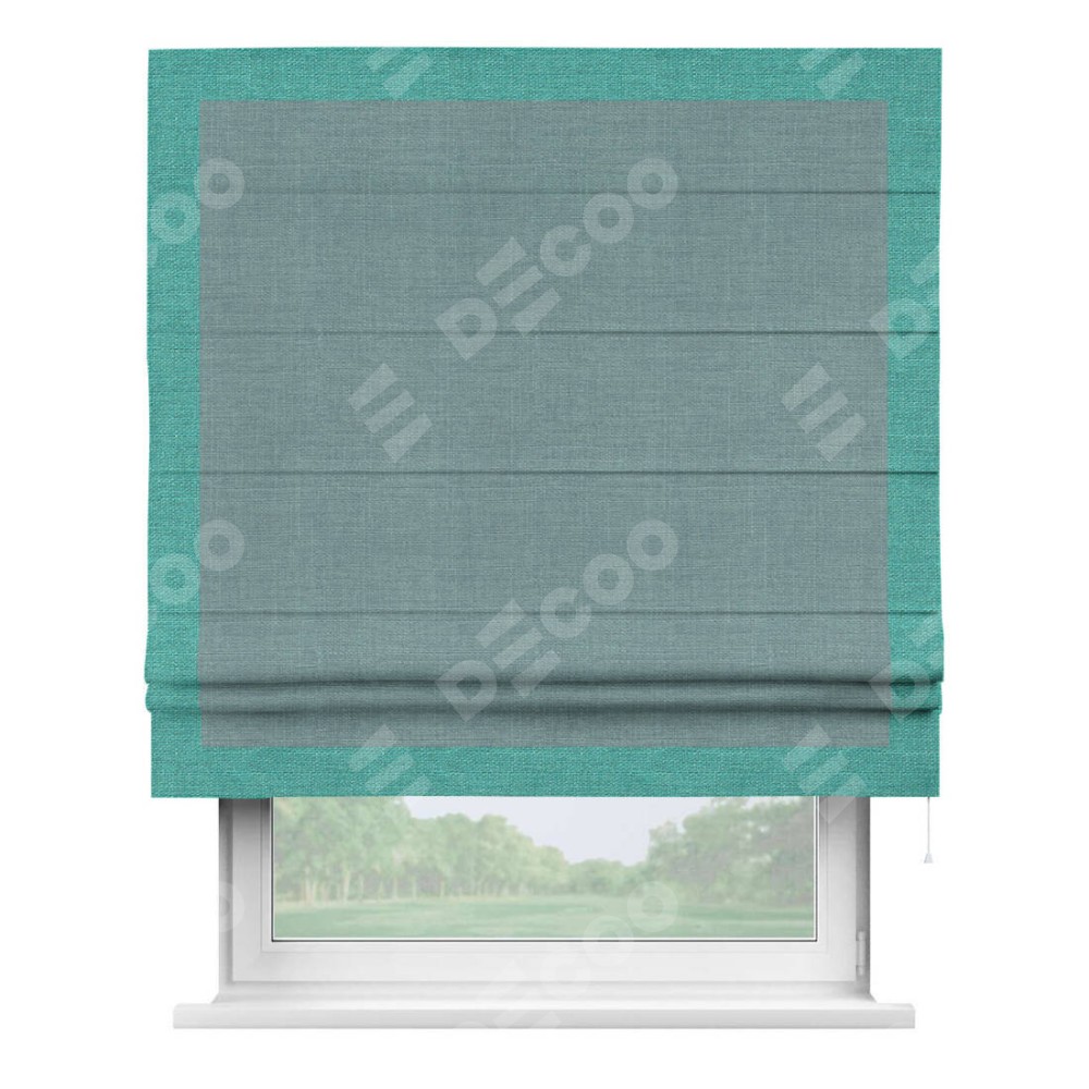 Римская штора производителя «Cortin», используется для проёма, пошита из ткани лён голубой, артикул 74736. Отделка шторы кантом «Чесс», ткань для канта используется из льна разной расцветки на выбор. Имеет универсальный механизм и подходит для монтажа: на потолок, на стену и в нишу.