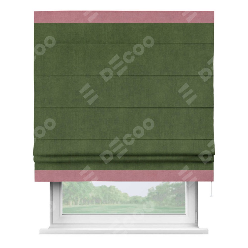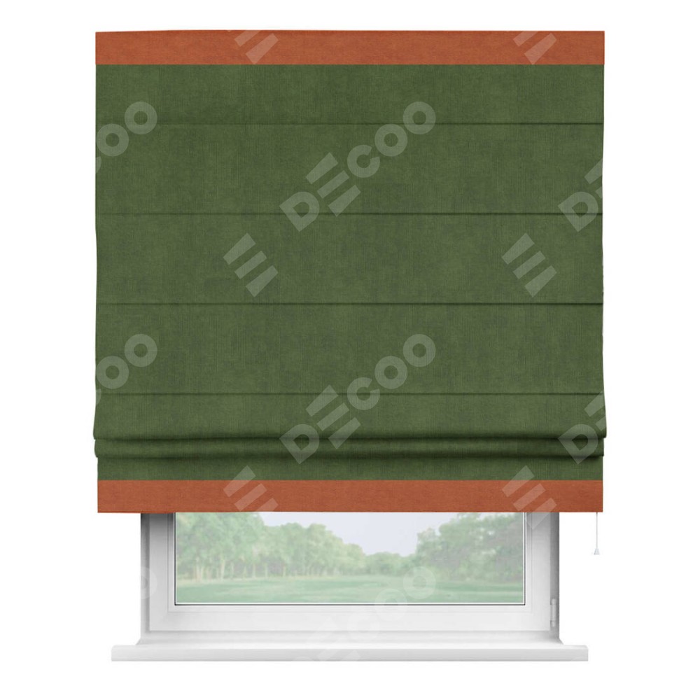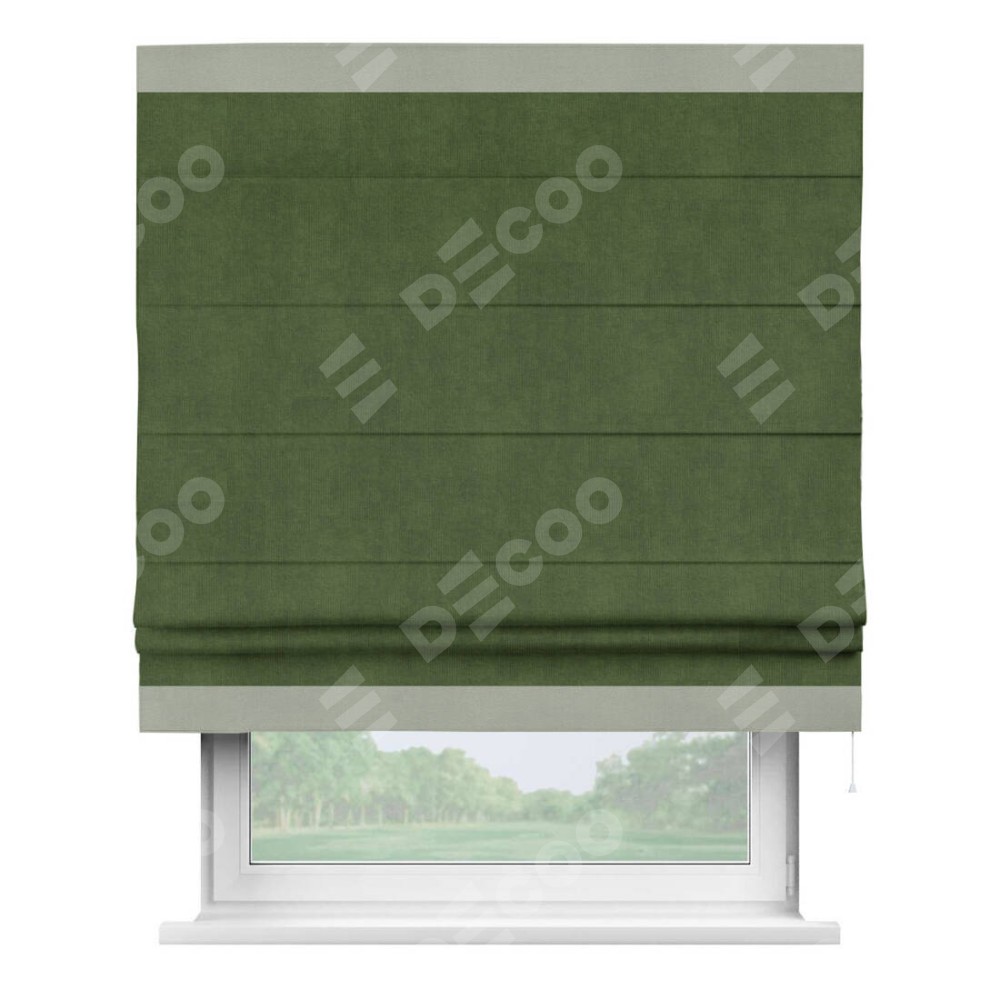 Римская штора производителя «Cortin», используется для проёма, пошита из ткани вельвет тёмно-салатовый, артикул ткани 33805. Отделка шторы кантом «Горизонт», ткань для канта используется из вельвета разной расцветки на выбор. Имеет универсальный механизм и подходит для монтажа: на потолок, на стену и в нишу.