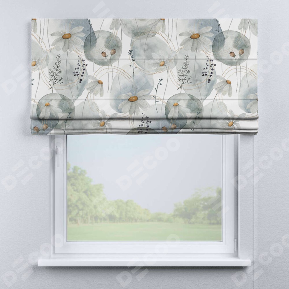 Римская штора производителя «Cortin», используется для проёма, пошита из ткани блэкаут с нанесением сублимационной печати «Ромашки акварель». Имеет универсальный механизм и подходит для монтажа: на потолок, на стену и в нишу.